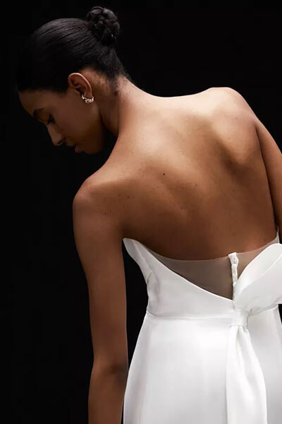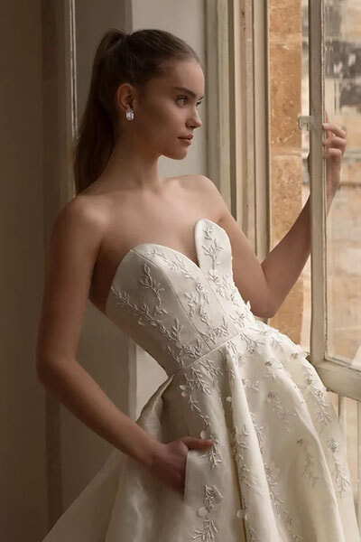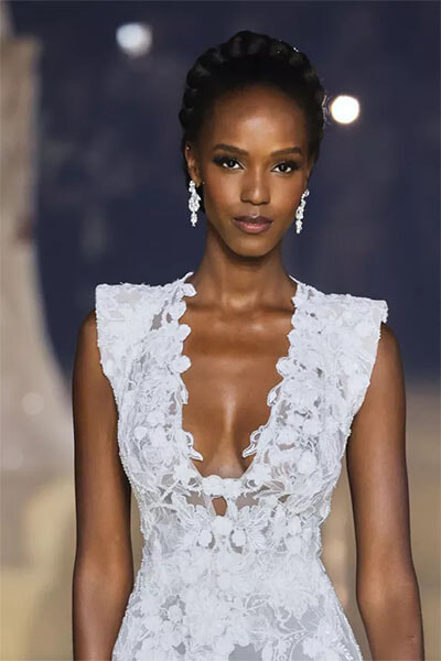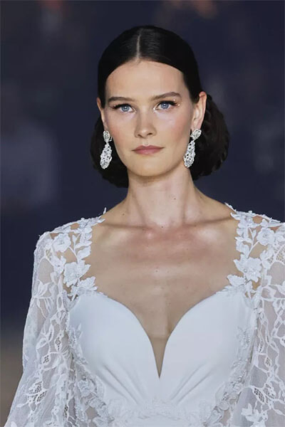 こうした前提からすると、有利なのはなんといってもボブ。とくにウェーブで柔らかさを出したアレンジがおすすめだ。また、自然に下ろしたロングヘアもいいだろう。「高い位置のポニーテールでもそうですが、テクスチャーに手を加えて、動きを出します。艶のあるストレートのポニーテールはむしろファッションショーのトレンドです」とファッションウィークでもヘアを手がけるガエルは説明する。「ウエディングでは、顔を引き立てるために、額やこめかみにかかる前髪も重要になります」