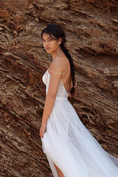 美容師とクライアントを結ぶマッチングアプリChosenに出店するフランスのヘアスタイリストのガエル・ベルトレッティによると、数シーズン前から大流行しているのはナチュラルスタイルだという。「ボヘミアンムードのスタイリングは相変わらず大人気。中にはさらにナチュラルなルックを選ぶ花嫁もいます。普段の雰囲気のまま、それでも普段よりきれいに、というのが彼女たちの希望です」とガエルは分析する。ウエディングドレスデザイナー、ロール・ドゥ・サガザンのフォトシューティングでヘアを担当する彼女は、撮影現場での経験を通してブライダルヘアの知識を深めたという。「トライアルの時はクライアントにまず、普段どんなヘアスタイルをしているのか質問します。彼女たちが何よりも望んでいるのは(これはメイクにも言えることです)、自分らしくあることですから」