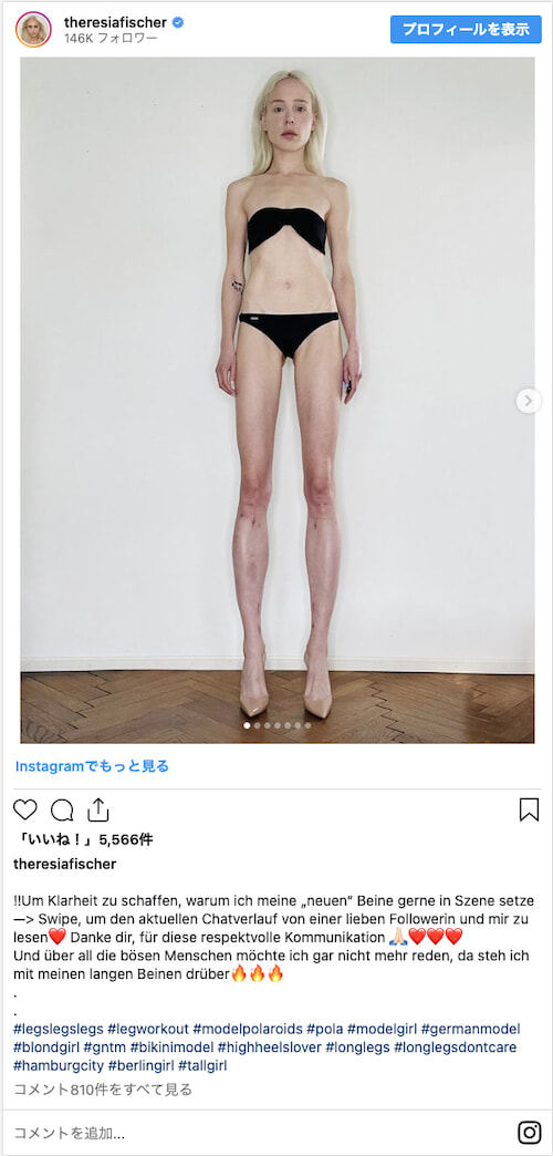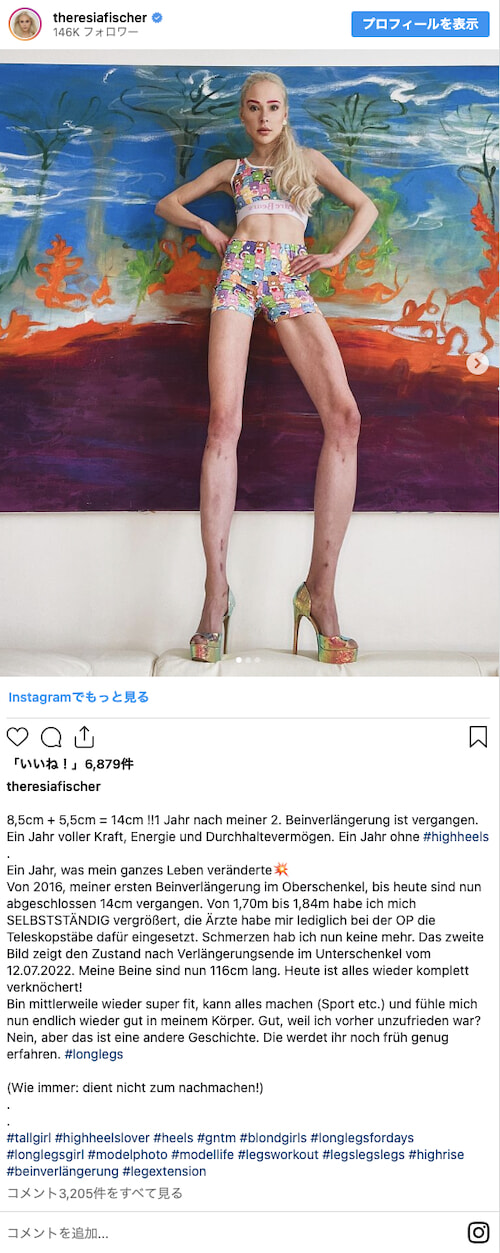 下着姿で腰に手を当て、誇らしげにカメラに向かってポーズをとるドイツ人モデルのテレジア・フィッシャー。膝下やすね、足首に傷跡が見えるのは事故に遭ったせいではない。脚を長くして身長を伸ばす手術の痕だ。フィッシャーは今年3月、2016年からの人体改造の成果を14万6000人のフォロワーに披露した。