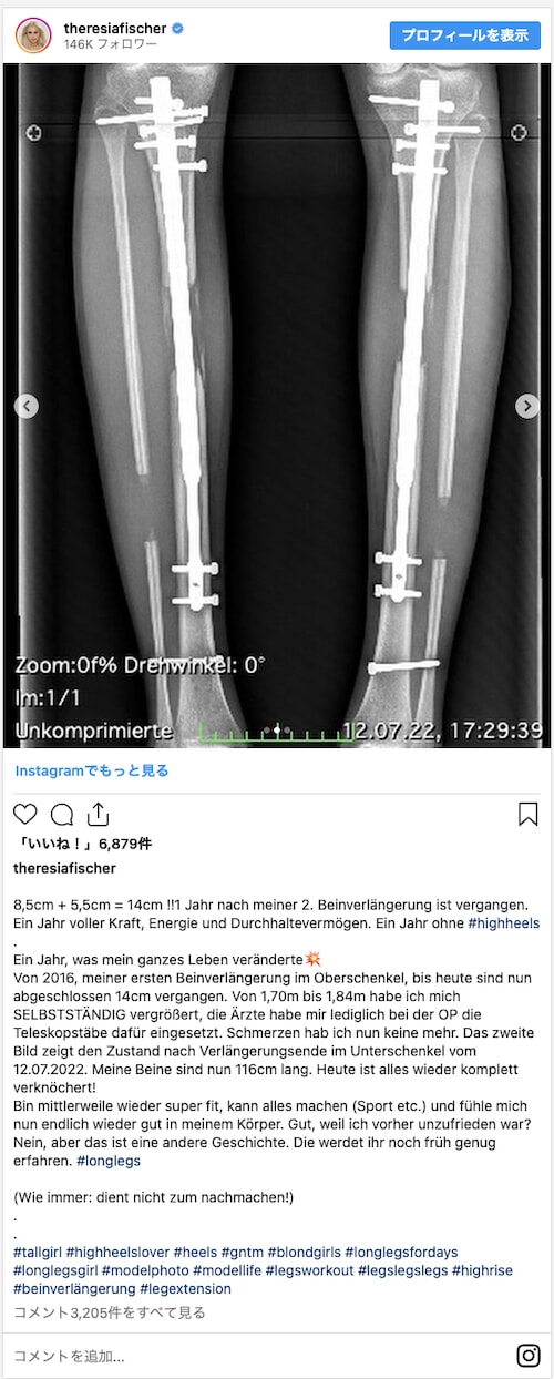 身長に悩んでいたドイツ人モデルのテレジア・フィッシャーは手術で脚を14cm伸ばした。最初の手術から7年経ったいま、SNSへ写真を投稿し、自分の体験を共有した。