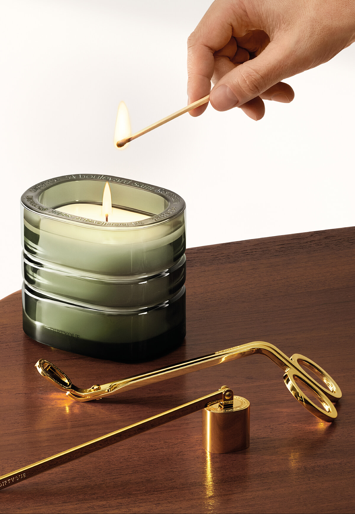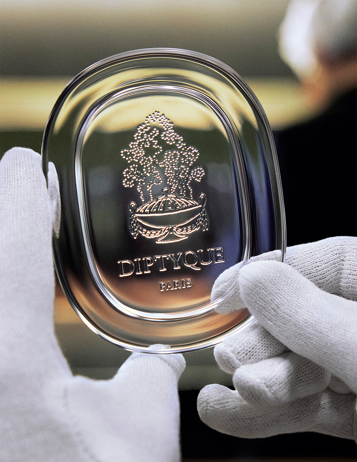 ディプティックの魂を象徴する香炉が彫られたガラスのリッド(蓋)は、香りを楽しむ間は底に敷いて接触物の保護となるようデザインされている。