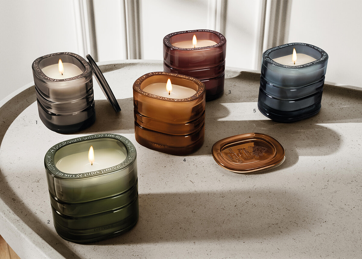 フレグランスキャンドルの誕生60周年を迎えた2023年、ディプティックからプレミアムな新しいキャンドル「レ モンド ドゥ ディプティック(ディプティックの世界)」が発売された。まだ知られていない土地の自然と文化にインスパイアされた5種の香りが導く“遥か彼方への旅”は、キャンドルの蓋を開けることから始まる。初のリフィラブルなキャンドルを収めるのは、一枚岩を彫刻したような楕円のガラス容器だ。デザインしたのは建築家でインテリアデザイナーのクリスティーナ・チェレスティーノ。外側に刻まれた2本の線により3層に見えるのは、3人の創業者へのオマージュだという。