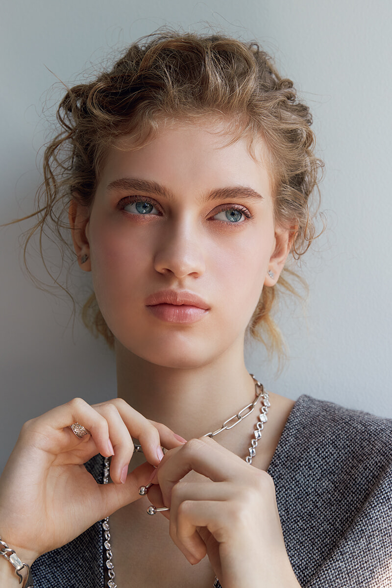 トップ¥74,800/ポステレガント ネックレスにしたキーチェーン¥52,800、ブレスレット¥52,800/ともにエルナン エルデス、ロングネックレス¥264,000、リング¥41,800/ともにノアーク(以上エスケーパーズオンライン) ピアス/スタイリスト私物