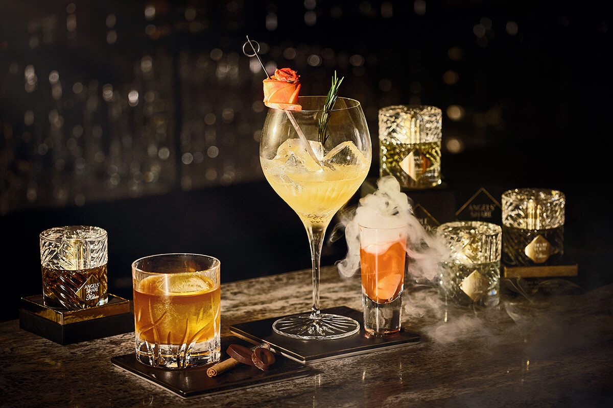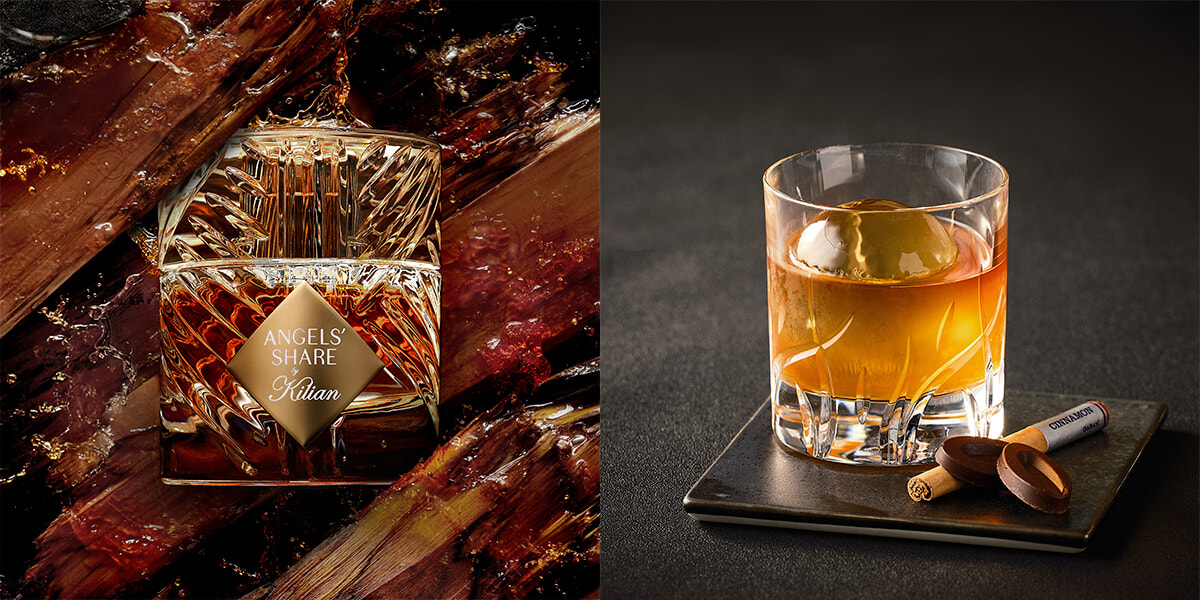 左:コラボレーションメニューのひとつは、キリアン・ヘネシーの幼少期の思い出、城のコニャック セラーに並ぶ、オークの木樽に染み込んだ砂糖やアルコールが放つ芳しい香りをインスピレーションに。エンジェルズ シェア オード パルファム 50ml ¥33,000/キリアン パリ(ブルーベル・ジャパン) 右:エンジェルズ シェア オード パルファムをイメージしたカクテルは、スパイシーでウッディな味わい。ヘネシー コニャック、バニラ、シナモンパウダー、ウォルナッツの組み合わせが、フレグランスの魅惑的な余韻を感じさせる。「エンジェルズ シェア by キリアン パリ」¥3,300(税込・サービス料別)