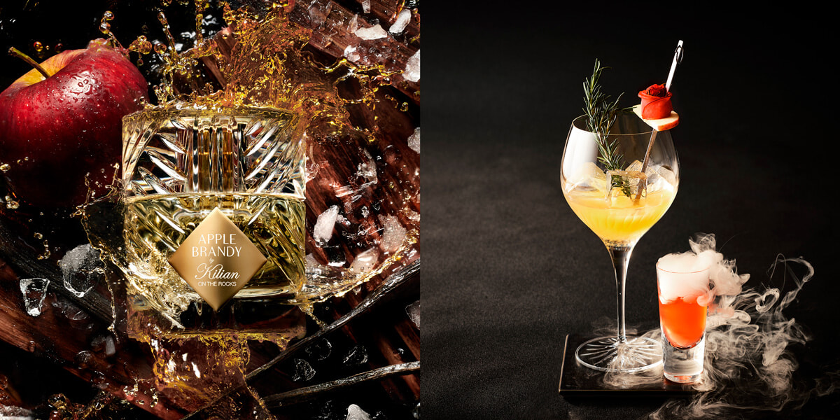 左:トップノートの象徴的な“オン ザ ロック”アコードが、氷のような冷感で人を酔わせる楽しい香り。ベルガモット、パイナップル、カルダモンをブレンドしたアコードによって、オリジナルフレグランスの香りをクールダウンさせながら、モダンで刺激的な香りに仕上げている。アップル ブランデー オン ザ ロックス オード パルファム 50ml ¥33,000/キリアン パリ(ブルーベル・ジャパン)  右:アップル ブランデー オン ザ ロックス オード パルファムの持つブランデーの芳醇な香りと艶やかなりんごの果実をイメージ。アップル ブランデーにカルヴァドス、アマレット、リンゴジュース、ライムジュースなどを組み合わせ、クールでモダンな香りを表現。「アップル ブランデー オン ザ ロックス by ハドソンラウンジ」¥3,080(税込・サービス料別)