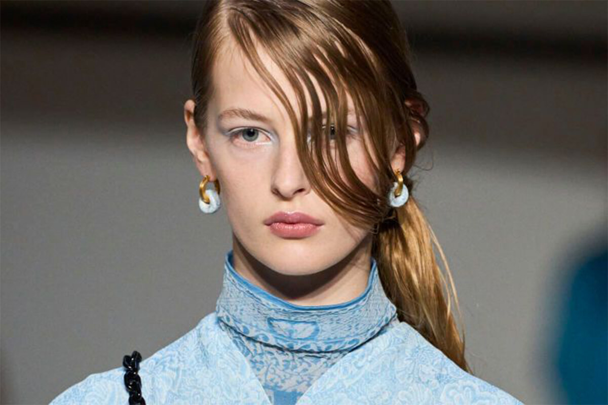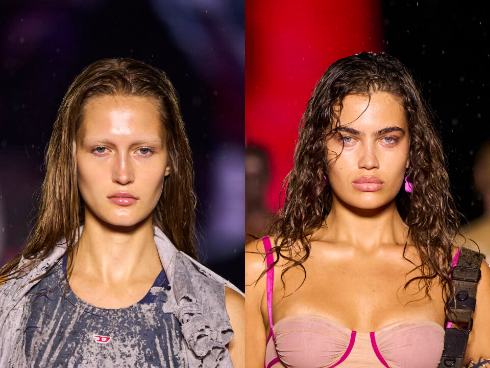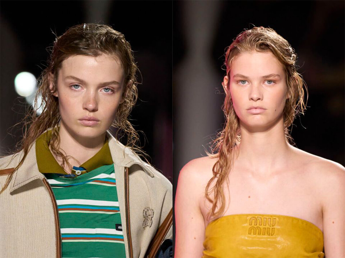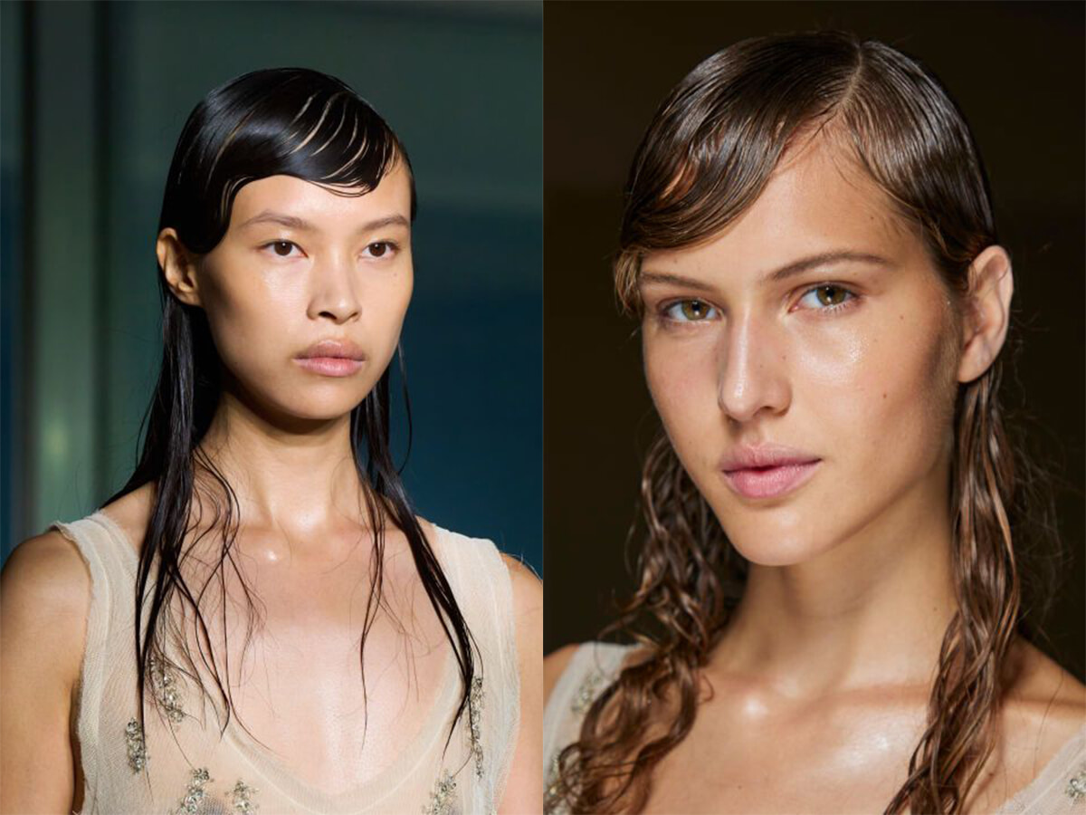 濡れたような質感が注目されやすくなる春夏シーズン。今シーズンは、ウェットなテクスチャーとレディライクなエレガンスを備えた”マーメイドコア”スタイルがトレンド入りした。「ミュウミュウ」のショーに登場したモデルたちのヘアは、ビーチサイドの風に吹かれたような半乾きの質感やうねった毛流れで、リアルな濡れ感を表現。「ジェイソン ウー」では、毛先に同様のフィーリングを加えながらも、フィンガーウェーブっぽく動きをつけた前髪にたっぷりとツヤを持たせた。セミウェットなヘアをツヤ肌と対比させた「ディーゼル」も見逃せない。毛流れや毛先の動きでラフさを出しつつ全体のシルエットはきれいに整え、ほどよくセクシーさを強調している。