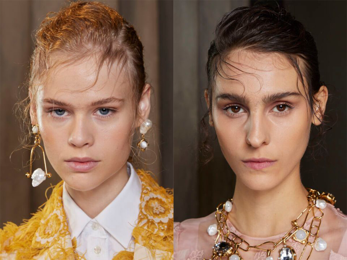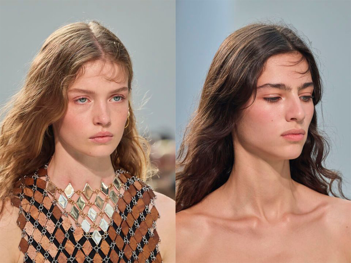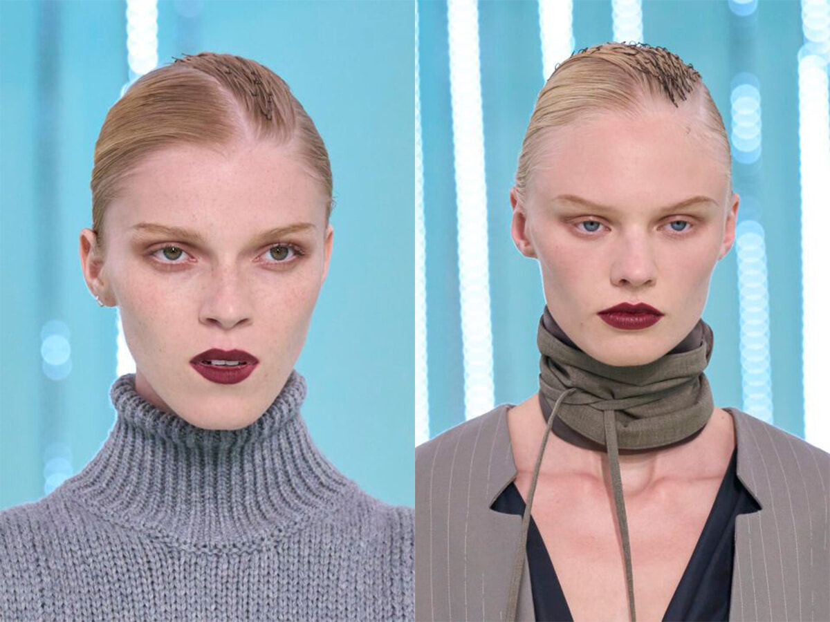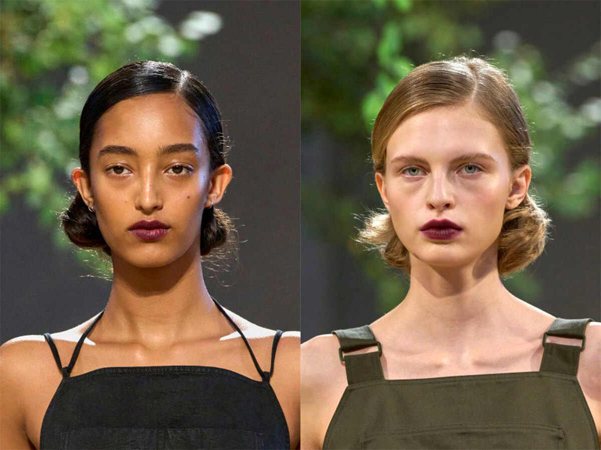濡れたような質感が注目されやすくなる春夏シーズン。今シーズンは、ウェットなテクスチャーとレディライクなエレガンスを備えた”マーメイドコア”スタイルがトレンド入りした。「ミュウミュウ」のショーに登場したモデルたちのヘアは、ビーチサイドの風に吹かれたような半乾きの質感やうねった毛流れで、リアルな濡れ感を表現。「ジェイソン ウー」では、毛先に同様のフィーリングを加えながらも、フィンガーウェーブっぽく動きをつけた前髪にたっぷりとツヤを持たせた。セミウェットなヘアをツヤ肌と対比させた「ディーゼル」も見逃せない。毛流れや毛先の動きでラフさを出しつつ全体のシルエットはきれいに整え、ほどよくセクシーさを強調している。