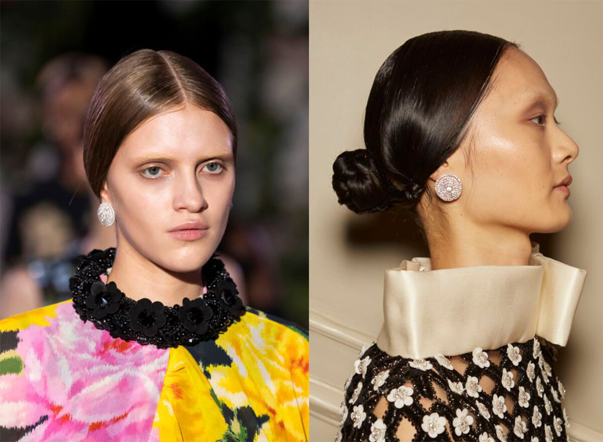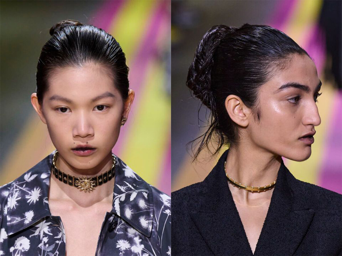 バレリーナのようなまとめ髪にも、多彩なバリエーションが。「ディオール」はすっきりとウェットな質感を持たせつつ、ラフな毛束感や生え際のヘアの動きでアナーキーなムードをプラス。クリーンなスタイルに、揺るぎない強さを宿してみせた。「マックス マーラ」は、内側に巻きこんだ毛先をピンで留めて、ワイドな低めシニヨンのような形に。前後から見た時の印象の変化をうまく引き出している。そのほか、オールバックでマニッシュに仕上げた「サンローラン」や、サイドのヘアで耳を隠し人間離れした世界観を打ち出した「リチャード クイン」などの例も。