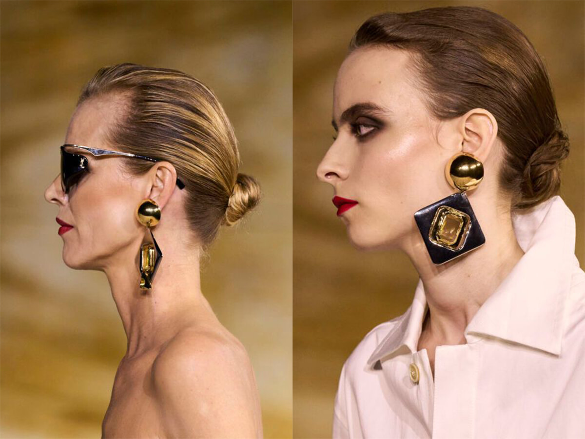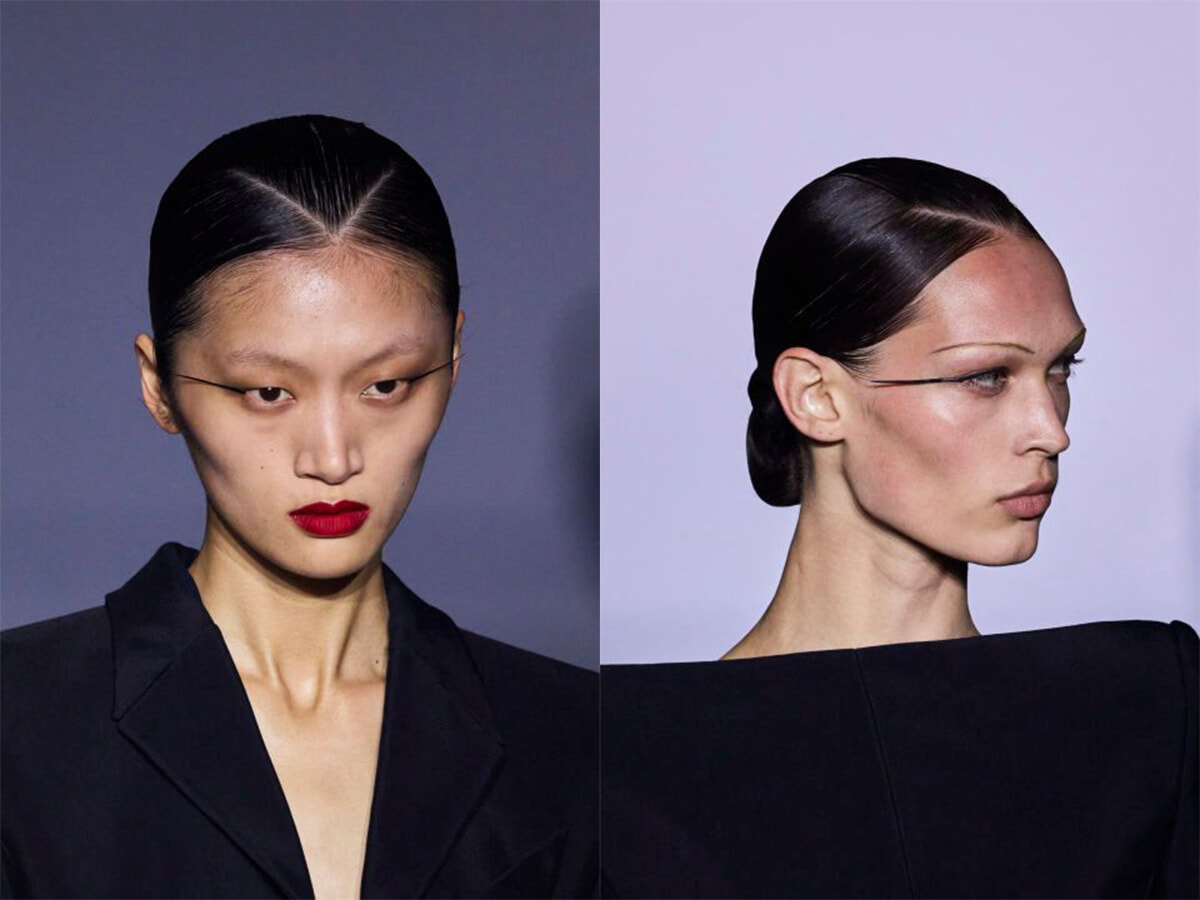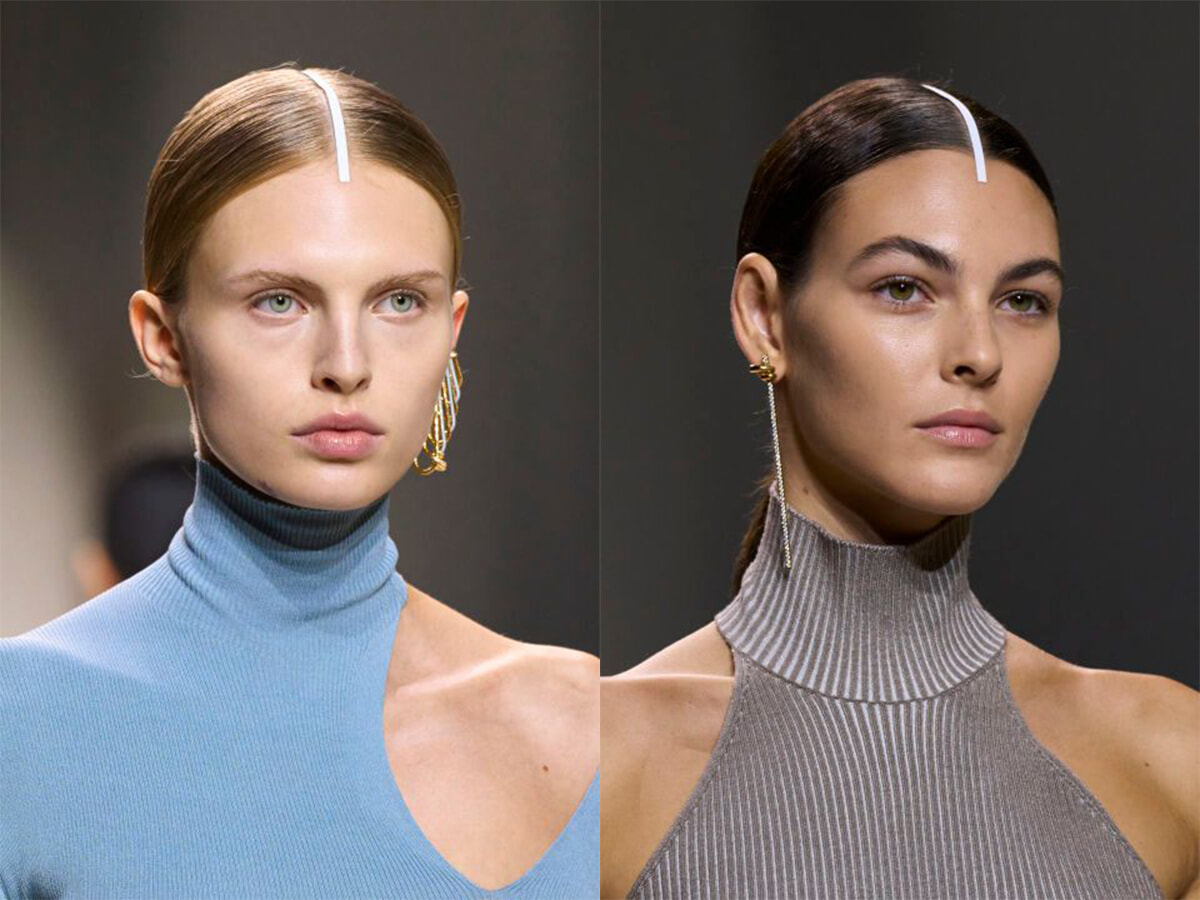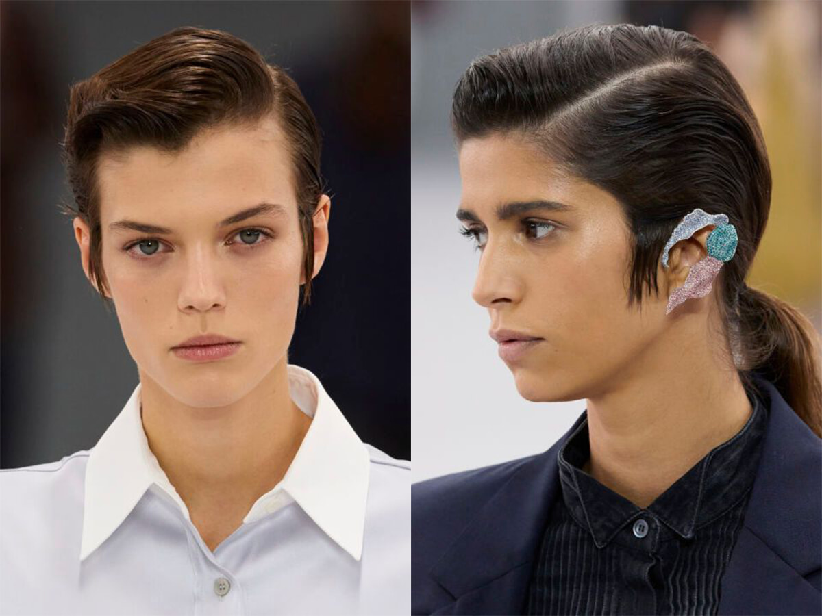 今シーズンは、まとめ髪の分け目に独自の工夫をこらしたスタイルも豊作だった。「フェンディ」では、タイトにまとめた完璧なセンターパートを、白いストリングでおめかし。ミニマルな装いの中で、モダンかつアーティスティックなエレメントが大きな存在感を放つ。とことんグラフィカルに決めたのが「ミュグレー」や「ボス」だ。前者はフロント部分のヘアで「V」の字を描き、後者は分け目のラインをサイドに2本つくって、近未来的な現代のグラマラスを体現。また「ロエベ」では、タイトな横分けにしたヘアを後ろに流してリーゼント風に。毛先は後ろでまとめ、マニッシュさとクリーンな印象をフュージョンさせて。