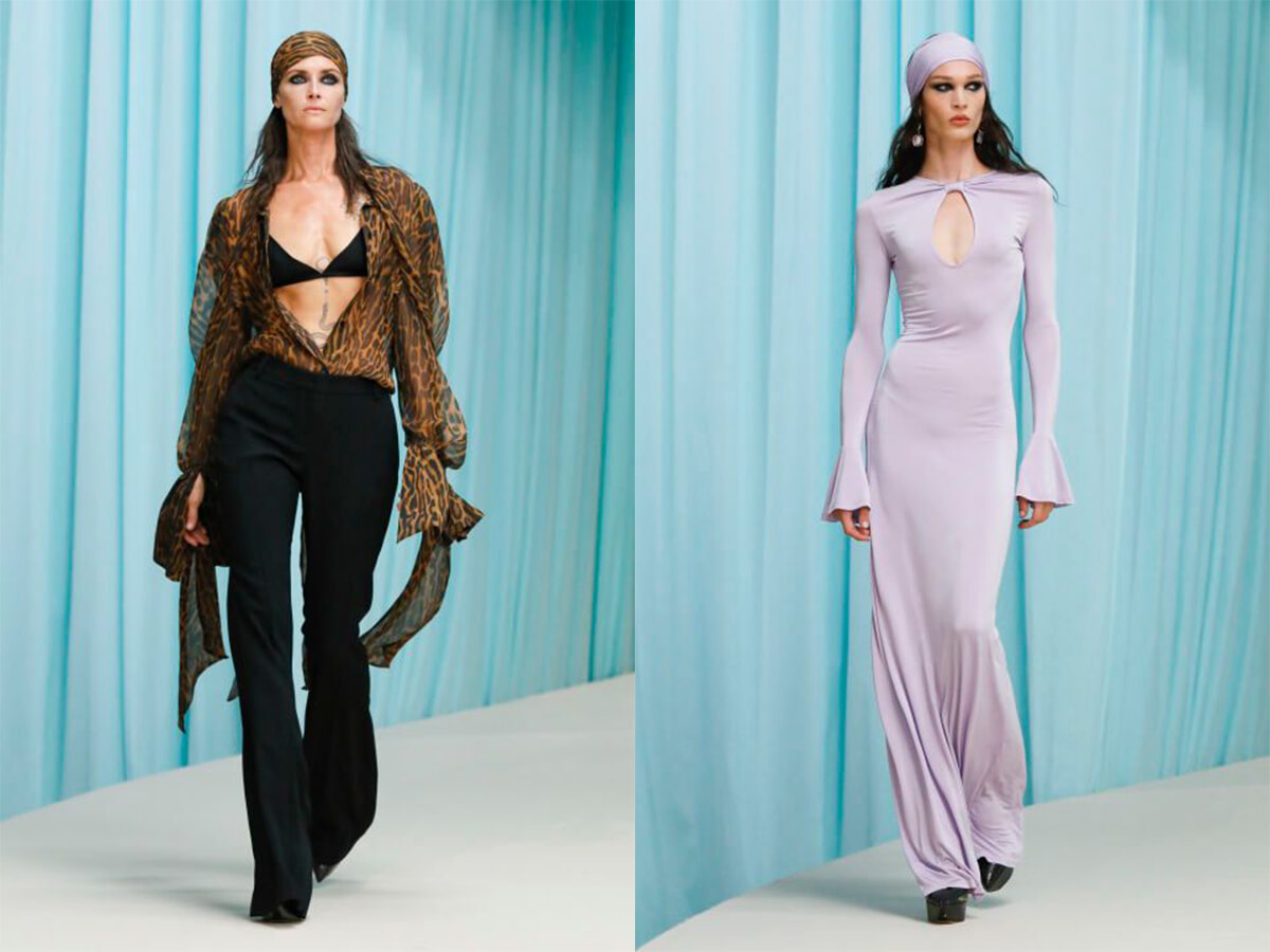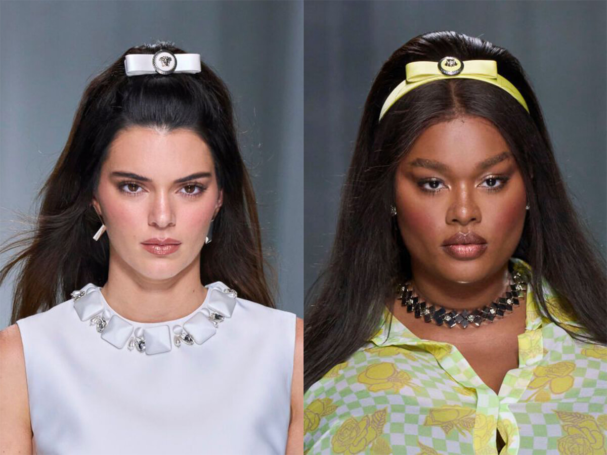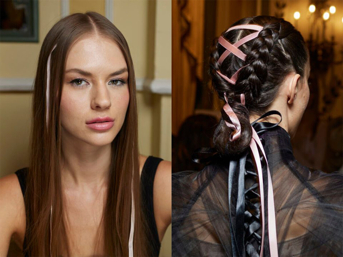 今季は、リボンを印象的なピースとしてヘアに使ったメゾンが増加。バレリーナのような雰囲気を醸すサテンからファンシーな魅力を引き出すシフォン生地まで、多彩な用い方が見受けられた。ドレスルックが豊富だった「クリスチャン シリアーノ」は、ウェアとリンクするサテンのリボンをヘアに編み込み、バックスタイルに華やぎを。服とリンクしたリボン使いは、「コリーナ ストラーダ」でも。幾本もの細いブレイドを手染めのシフォン地リボンとともに編んで、フォークロア風のムードを高めながらもプレイフルに決めた。ふくらみを抑えたフォーマルな形のリボンを随所にあしらったのは「ヴェルサーチェ」。メゾンが築いた90年代の功績を振り返った今回のコレクションのクラシカルな美しさを、ヘアスタイルでも加速させた。