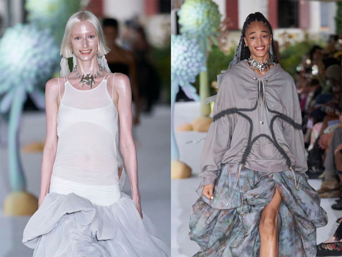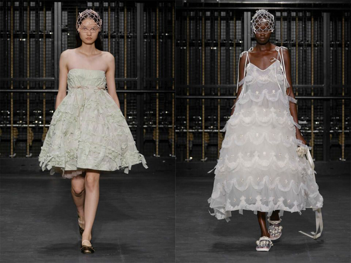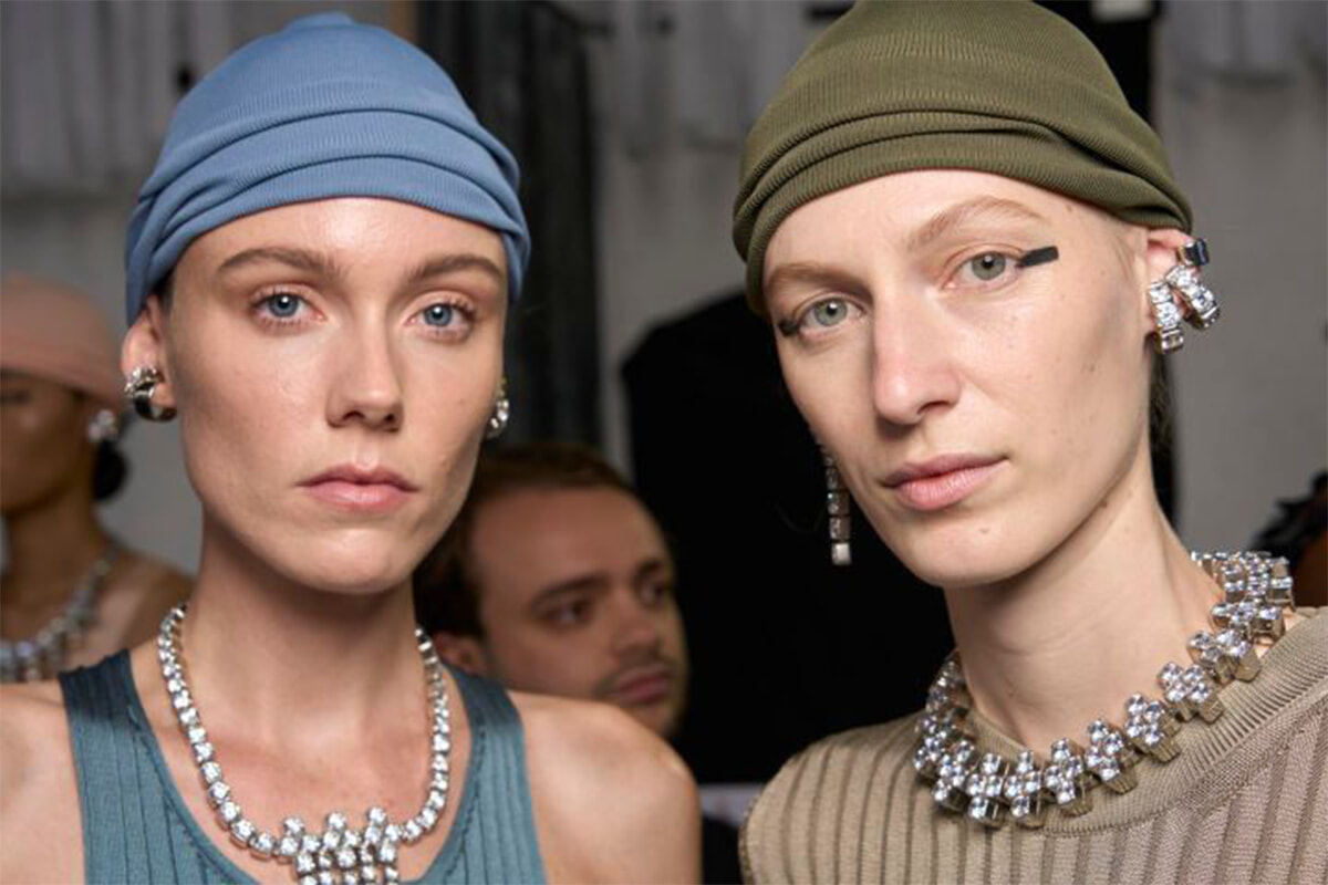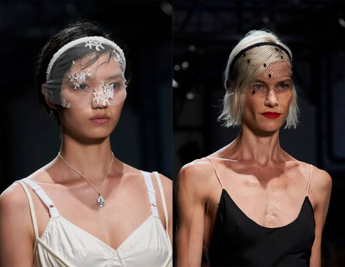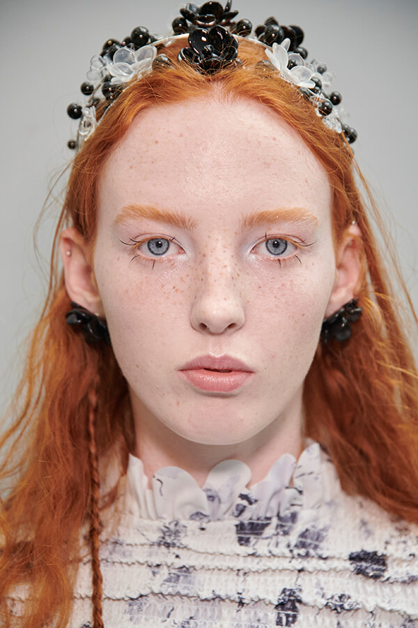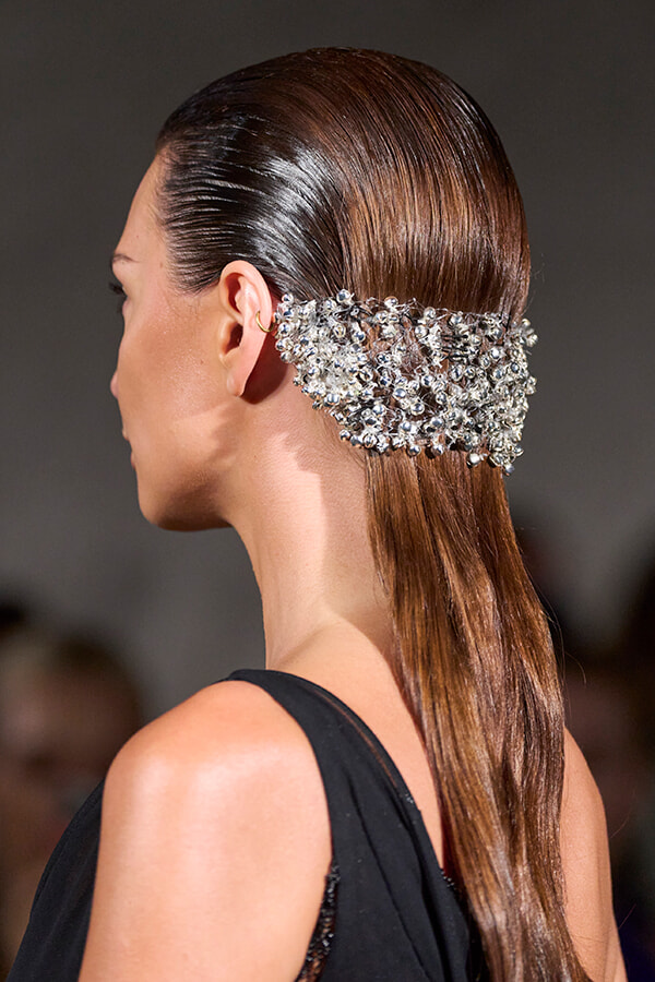 ドレスアップの機会に取り入れたい華やかなピースには、とことんロマンティックなアイテムを。「シモーン・ロシャ」には、目の下まですっぽり覆うサイズのビーズ製ヘッドピースが登場し、ブランドの打ち出す幻想的な世界観にシュールな佇まいを添えた。「ヌメロ ヴェントゥーノ」ではレースつきのカチューシャがモデルの目もとを飾り、ヴェールをまとったように神秘的な雰囲気に。またビーズの花々が頭を飾る「スーザン ファン」や、後頭部でヘアをタイトにまとめた「トリー バーチ」など、細かな装飾をワイドなサイズ感で装えるヘアアクセが多数お目見え。