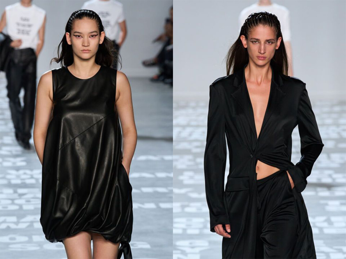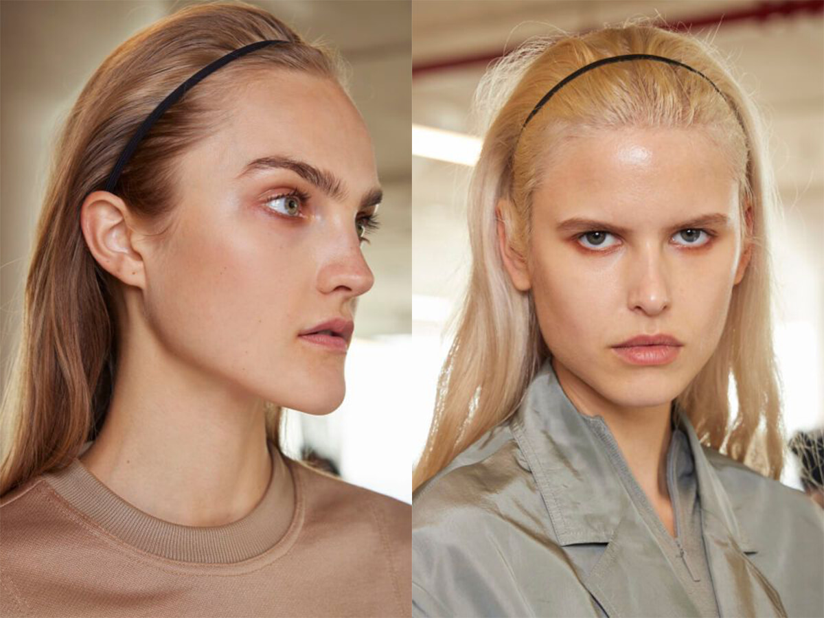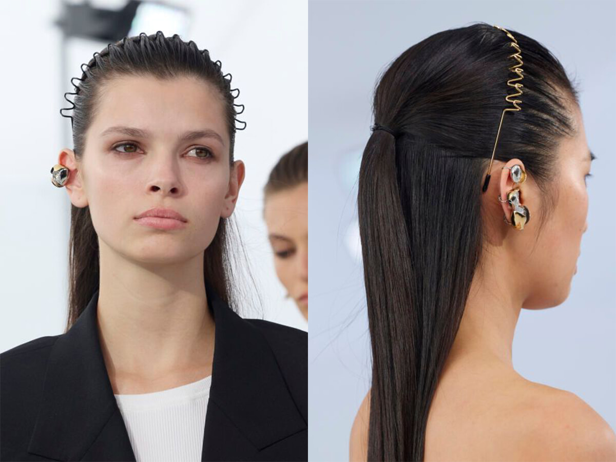 細身のワイヤーでできたコームカチューシャは、90年代に流行したヘアアクセのひとつ。「ジバンシィ」は従来の形を再解釈した波型のアイテムで、顔まわりにモダンなシルエットを構築した。クリエイティブディレクターがピーター・ドゥとなって初の新生「ヘルムート ラング」では、ブランドが隆盛を誇った90年代へのオマージュの一環としてこれを採用。タイトなオールバックをつくることで、モデルに施されたワイドなアイラインメイクを引き立たせる役割も担っている。控えめなモダニズムを感じさせるのは、「ティビ」のようなストリングタイプ。オールバックヘアを横切る1本のラインが、シンプルでラグジュアリーな品格を連れてくる。