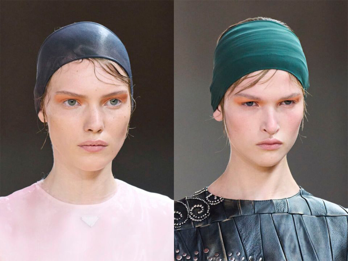 強い個性を演出したいときは、異国情緒を感じさせつつシルエットをすっきりさせてくれるターバン風のアイテムに注目を。ワイドなヘッドバンドを用いたのは「プラダ」。セミウェットな前髪を少量のぞかせるテクニックや、シアーな光沢素材とマットなファブリックとの使い分けで、新鮮な表情に。服と連動させた生地や色彩を使えば、より簡単に似合わせが可能だ。「ニナ リッチ」は黒の囲み目アイメイクと合わせてオリエンタルなグラマーを感じさせ、ターバン風のキャップでヘアを覆った「ジル サンダー」では森に棲む妖精さながら、アンドロジナスな存在感を放つルックに仕上げていた。