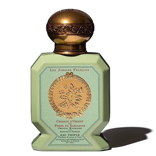 菜園をイメージした水性香水。「植物の茎の香り。フレッシュな花屋さんやマルシェにいるよう。クリーンな生命力を感じる」。レ・ジャルダン・フランセ・ドゥ・オフィシーヌ・ユニヴェルセル・ビュリー オー・トリプル クレッソン・ドリオン・エ・ペルシ・ドゥ・サルデーニュ 75ml ¥24,200/ビュリージャパン