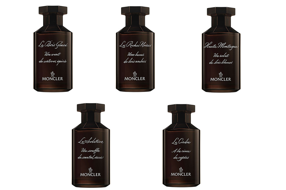 上段左から:レ ソメ モンクレール ル ボワ グラッセ オードパルファム、同 レ ロッシェ ノワール オードパルファム、同 オート モンターニュ オードパルファム、同 ル ソルスティス オードパルファム、同 ラ コルデ オードパルファム 各100ml 各29,260/ブルーベル・ジャパン