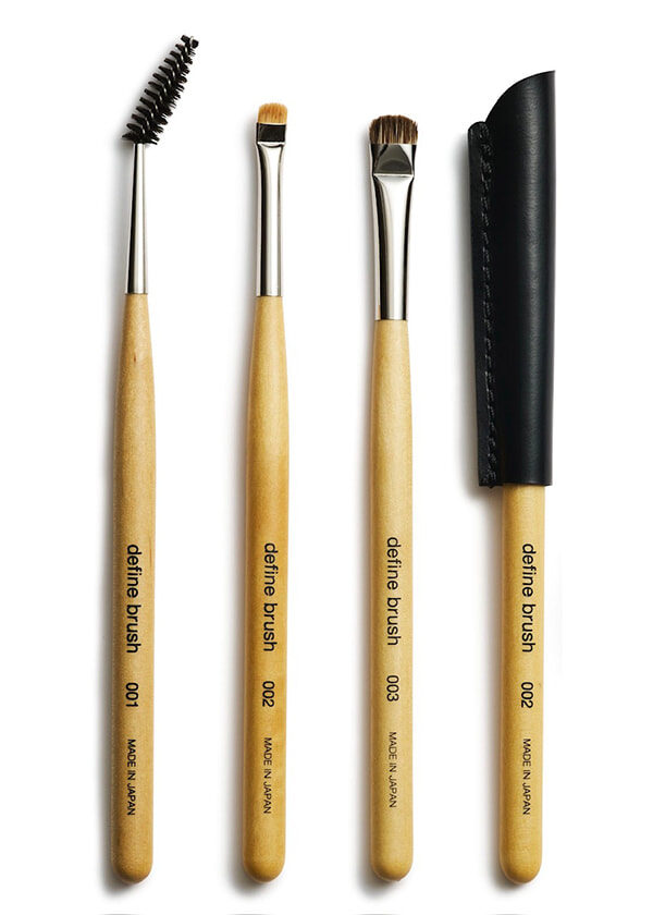 左から: 眉の輪郭をぼかしたり、毛流れを整えたり。肌当たりも柔らかで使いやすい。スクリューブラシ 001 ¥4,180、眉毛の一本一本を自然に描けるほど薄く仕上げられたブラシ。穂先の手前には20°の角度がつけられている。ベントアイブロウブラシ S 002(キャップ付き) ¥5,720、穂先の手前を15°に曲げた厚めのブラシ。骨の凹凸にフィットして、眉のアウトラインをふんわりと思い通りに描ける。ベントアイブロウブラシ L 003(キャップ付き) ¥6,380/ディファインブラシ