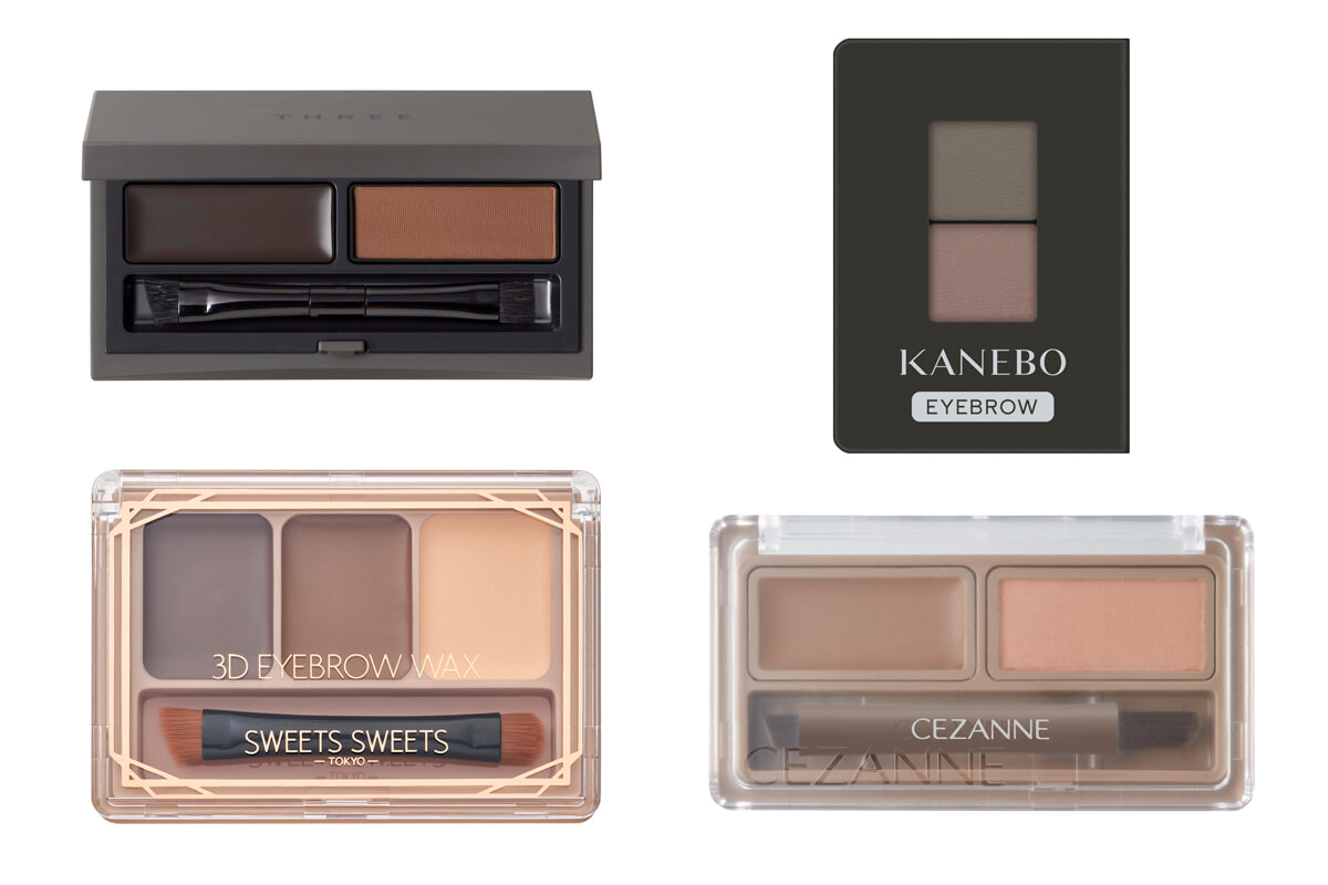 左上: アドバンスドアイデンティティ ブラウシェーピングデュオ 06 ¥4,180/スリー 右上:カネボウ アイブロウデュオ ED3 ¥2,300/カネボウインターナショナルDiv. 左下: スウィーツスウィーツ 3Dアイブロウワックス 01 ¥990/シャンティ 右下: アイブロウワックス&パウダー W2 ¥660/セザンヌ