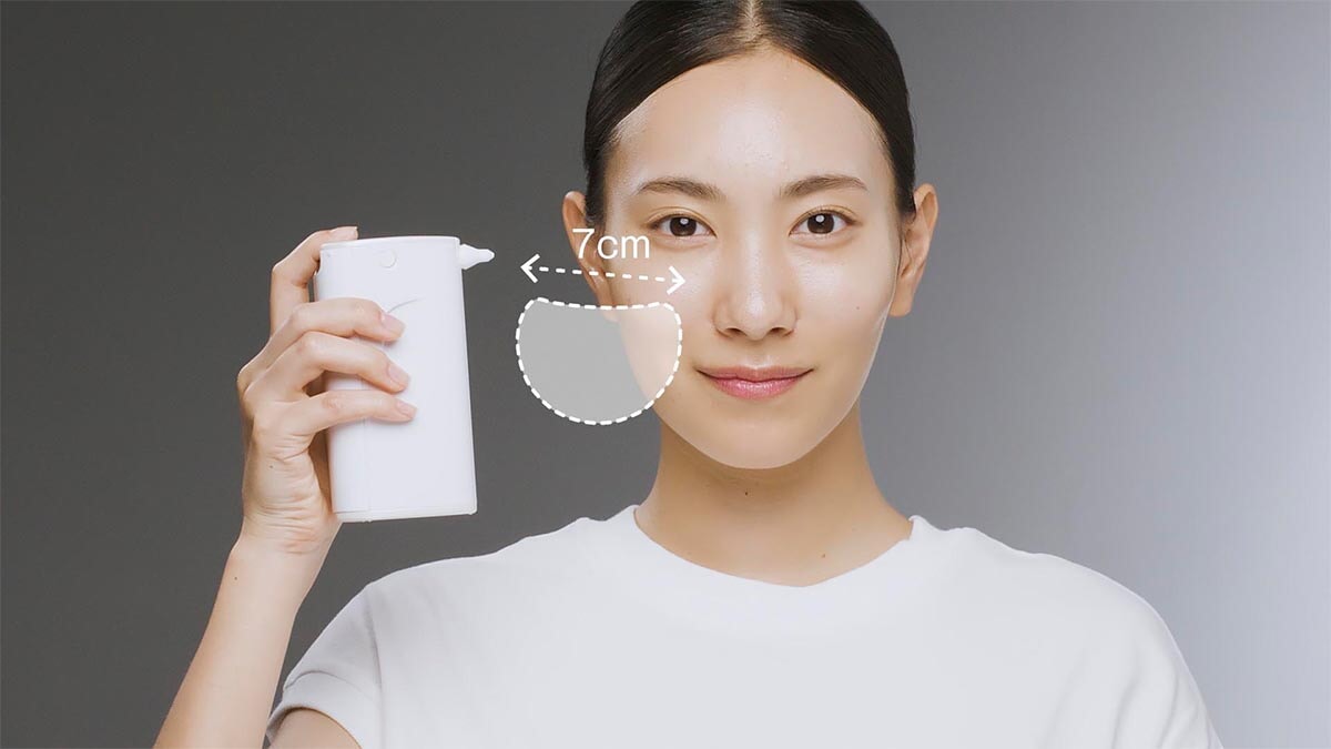 ファイバーを塗布する時は、肌と本体を7cmくらい離すのがコツ。デリケートな目の下には、いったん専用スポンジにファイバーをつけてから、目の下を軽く押さえてファイバーを肌に移します。はがす時は、水で濡らした指で肌とベールの境目をなで、浮き上がった箇所から簡単にオフ。