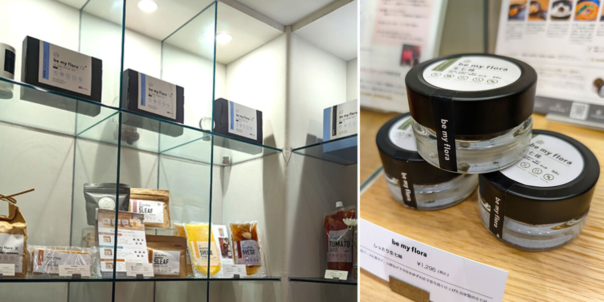 左: 写真上の弾の黒い箱はビーマイフローラ 10年熟成酵素+ 10g×9包 ¥2,800、10g×60包 ¥19,500。料理に使われるベジブロスや有機発芽玄米餅の販売も。 右: ビーマイフローラ しっとり生七味 50g ¥1,296