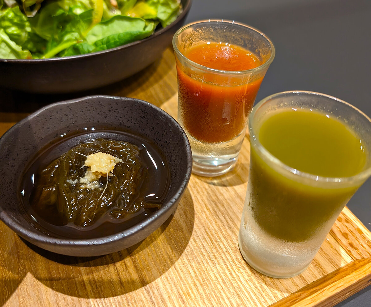 メインの料理に加えて、ゴロゴロ野菜がたくさん入った汁物(メインが麺の場合、汁物はなし)、フレッシュなサラダ、もずく酢、そしてミニサイズのドリンクまで……! おすすめは、ミニサイズのドリンクともずく酢から食事をスタートすることです。