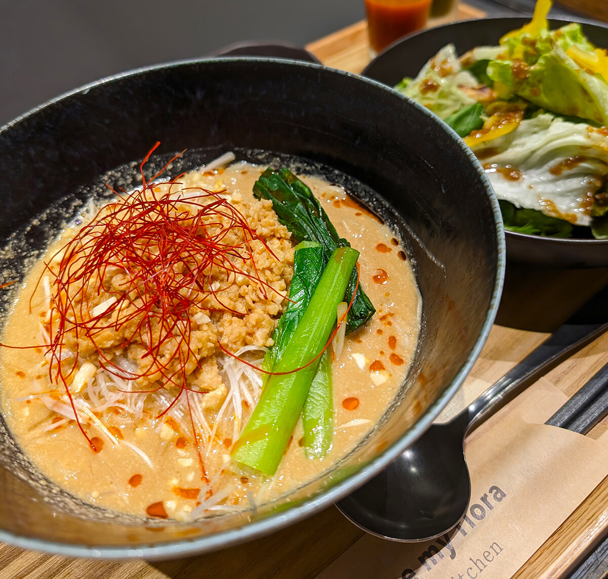 この日お昼を食べそこねていた編集担当TIと私。TIは最も人気のある「むくみスッキリネバネバ丼セット」、麺好きな私は「ヴィーガンピリ辛豆乳担々麺のセット」を注文しました。