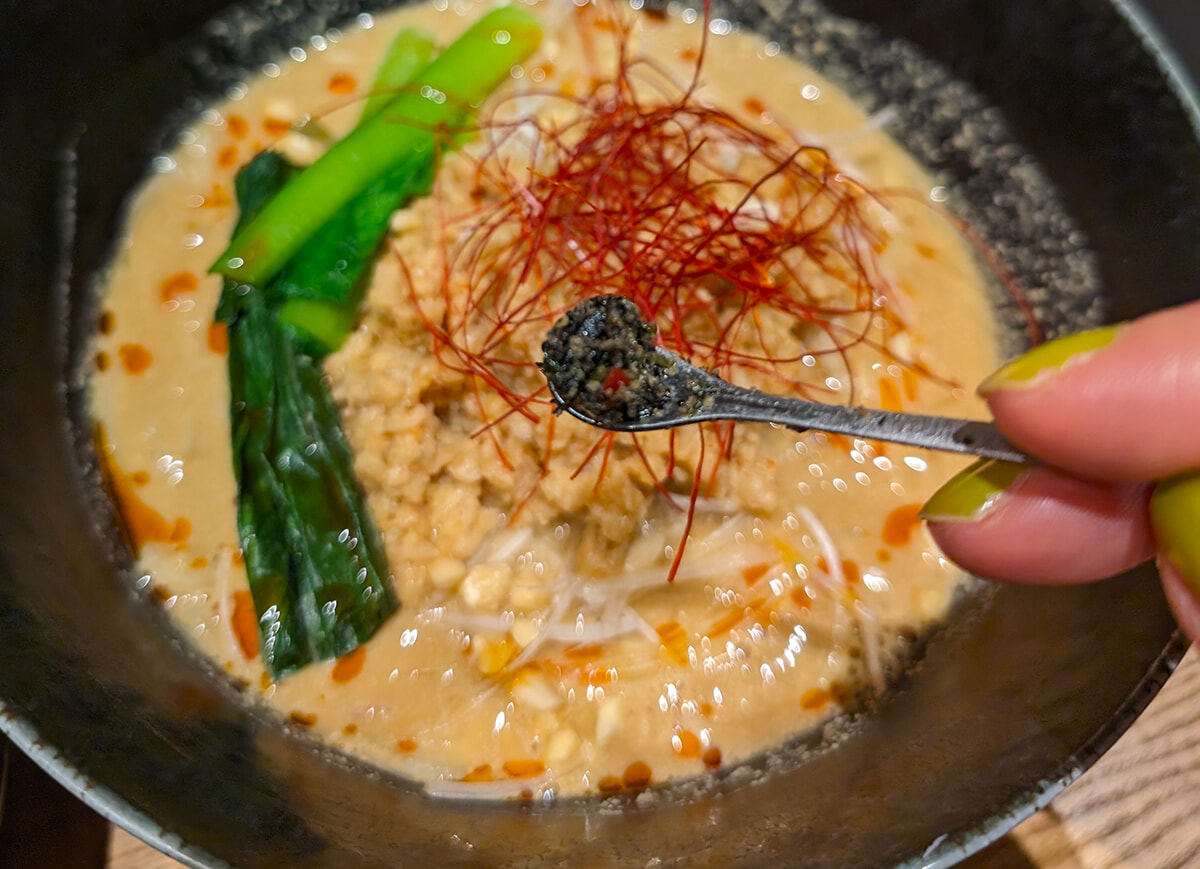 私が頼んだ「ヴィーガンピリ辛豆乳担々麺のセット」は、スパイシーな香りが鼻先をくすぐります。粟やキビなどを使った雑穀麺に、豆乳と赤味噌、白練りゴマのスープがからむ濃厚な味わい。グルテンフリーなのに、まろやかで食べごたえがあるんですね。