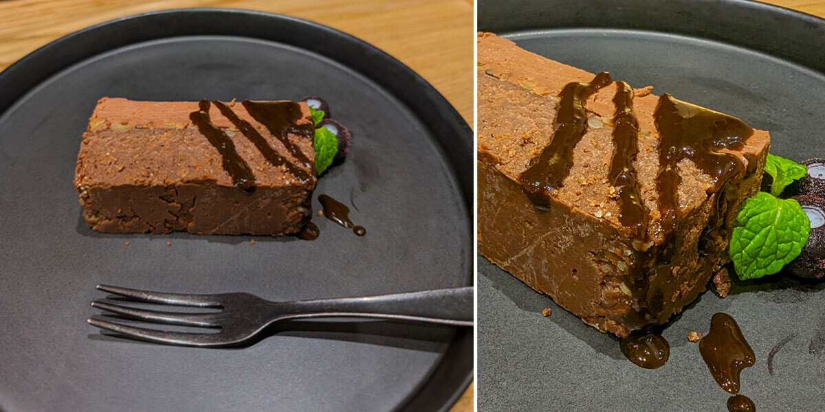 有機ハイカカオを3種類使ったテリーヌは、みっちり濃厚で「本当にグルテンフリー!?」と驚いてしまうほど。上のソースは「ビーマイフローラ 10年熟成酵素+」(ここにも使われてるんですね!)。ほんのり酸味が、ビターなチョコの味わいを引き立てます。