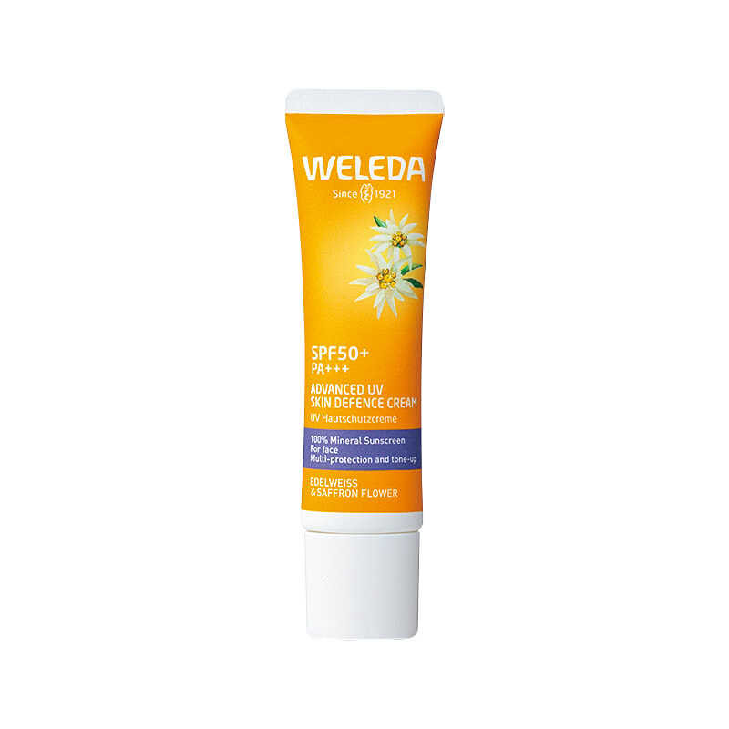 天然ミネラルフィルターで近赤外線やブルーライトをカットし、潤いバリアが大気中の汚れから保護。くすみもカバーする。エーデルワイス UVバリアクリーム SPF50+・PA+++ 30ml ¥3,080/ヴェレダ・ジャパン