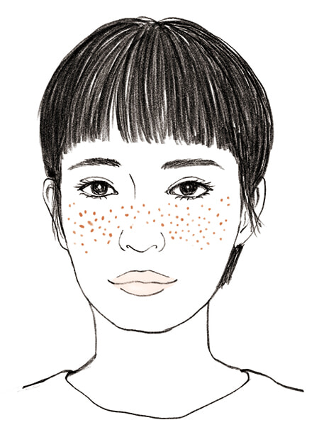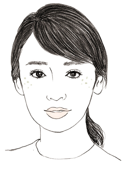 形と場所:小さな点で、鼻の上を通り頰の高いところを中心にちらばる。