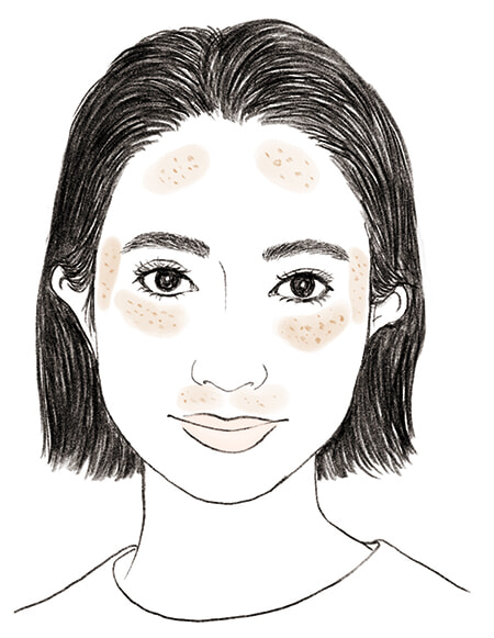 形と場所:老人性色素斑や肝斑と同じ場所に3~5mmの丸い点でできるため間違えやすい。