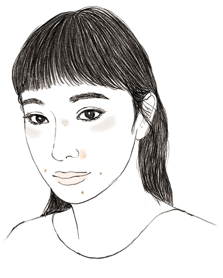 形と場所:1mmの小さいものから10cm以上の大きなものも。境界線がはっきりしている。頰の高い位置~こめかみにできやすい。