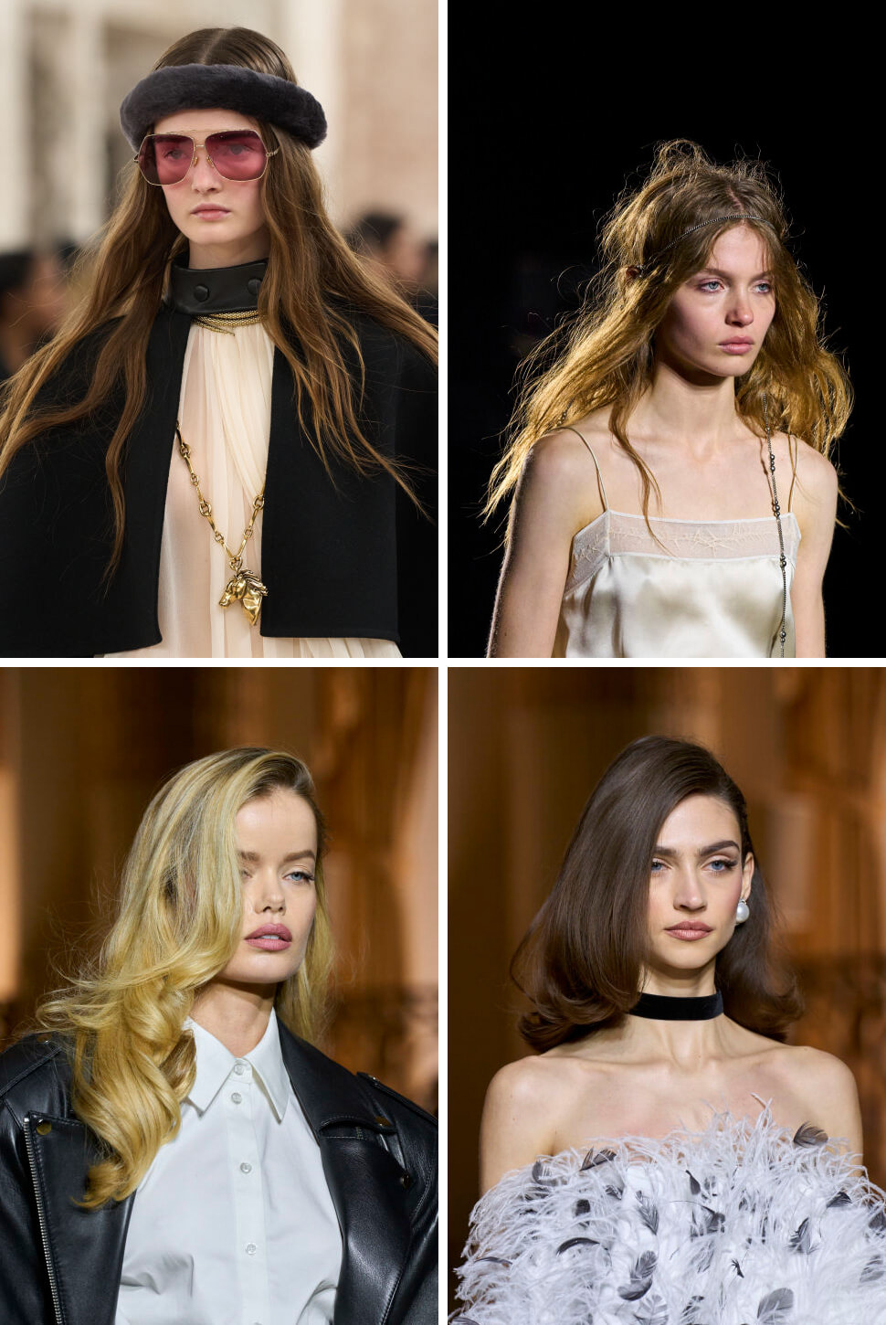 サラサラの質感が持ち味のロングヘアは、漂わせる雰囲気にバリエーションが。シルキーなセンターパートを柔らかそうなファー素材のヘッドバンドで包んだ「クロエ」や、同じくセンターパートのドライな無造作髪をワイヤーストリングでまとめた「アン ドゥムルメステール」など、自然体でボヘミアンなムードがまずひとつ。それと同時に美しくブローしたサイドパートの毛先を巻き髪にした「レトロフェット」のような、”いい女”感あふれるグラムなテイストのロングヘアも多く見られた。
