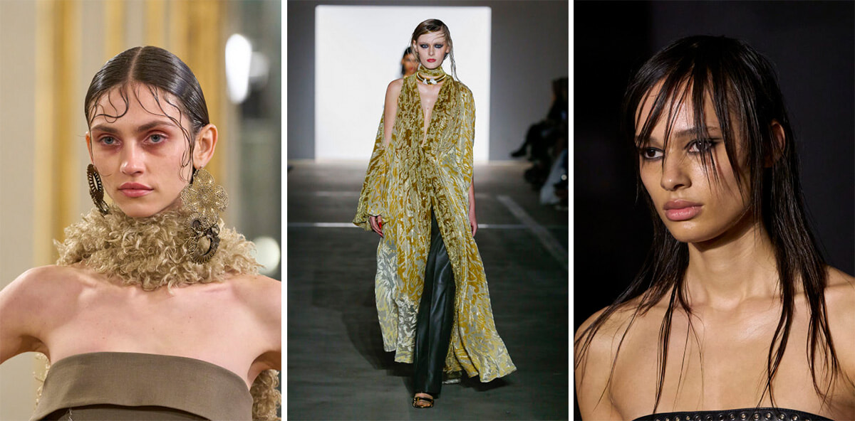 今季も引き続き人気が出そうなウェットヘアの中で目を引いたのは、少量だけ毛束を取ってつくる透けバングとの組み合わせ。「ロク」は前髪をすべて額に這わせるようにして、毛流れでランダムな模様を描いた。「プラバル・グルン」のサイドパートヘアは、横から流すようにして顔にかけ、しっかりめのメイクと呼応させてどこかセクシーな佇まいに。「ルドヴィック デ サン サーナン」はシャギーっぽくカットした濡れ前髪を黒の囲み目メイクと重ね、グランジ感と洗練された美しさを両立したムードを完成させた。
