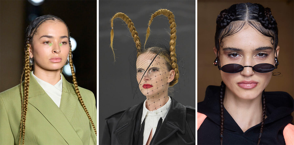 スッキリまとまった活動的な見た目のブレイドヘアが、茶目っ気あふれる触覚のような形をとってさらに進化。「ラブラム ロンドン」のランウェイには、長い三つ編みを左右へ下げたモデルの姿が。生え際のベビーヘアをも編みこんで、顔まわりのポイントとした。未知の動物の触覚や耳のようにも見えるのが「トム ブラウン」のアレンジ。後頭部から重力に逆らうかのごとく上へ伸びて前方へ大きな弧を描くさまは非常にポップでユニーク、もしくはどこかストイックなムードすら感じさせる。「ラポイント」はコーンロウをアレンジして前頭部にブレイドのお団子をつくり、後ろへ流して少女のように。ベビーヘアの毛流れを用いて額に模様を描くなど、個性を演出する工夫も。