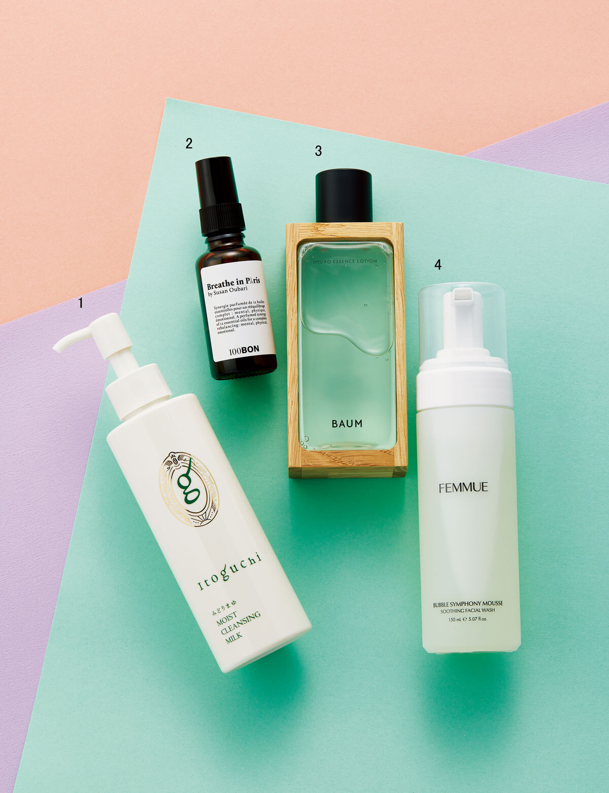 今春発売のフィールグッドを象徴するコスメたち。1.希少なみどりまゆの成分を主役に、シルクのような肌を目指すシリーズ。低刺激で優しく包むようにメイクオフ。イトグチ モイスト クレンジングミルク 180ml ¥3,850/きものブレイン 2.ビーツ由来のアルコールと12種の天然精油のブレンドで、呼吸を通してマインドのバランスを整える。ソンボン ブリーズ イン パリ スプレイ 30ml ¥4,400/フォルテ 3.四国地方の桧から抽出したひのき水を配合した、とろみのある濃密化粧液。肌の貯水力を高め、環境ダメージに負けない肌へ。森林浴のような香りも秀逸。ハイドロ エッセンスローション n 150ml ¥7,150/バウム 4.敏感肌にも対応する弱酸性のふわふわの泡が、潤いを残しながら洗い上げる。ファミュ バブルシンフォニー ムースウォッシュ 150ml ¥4,180/アリエルトレーディング