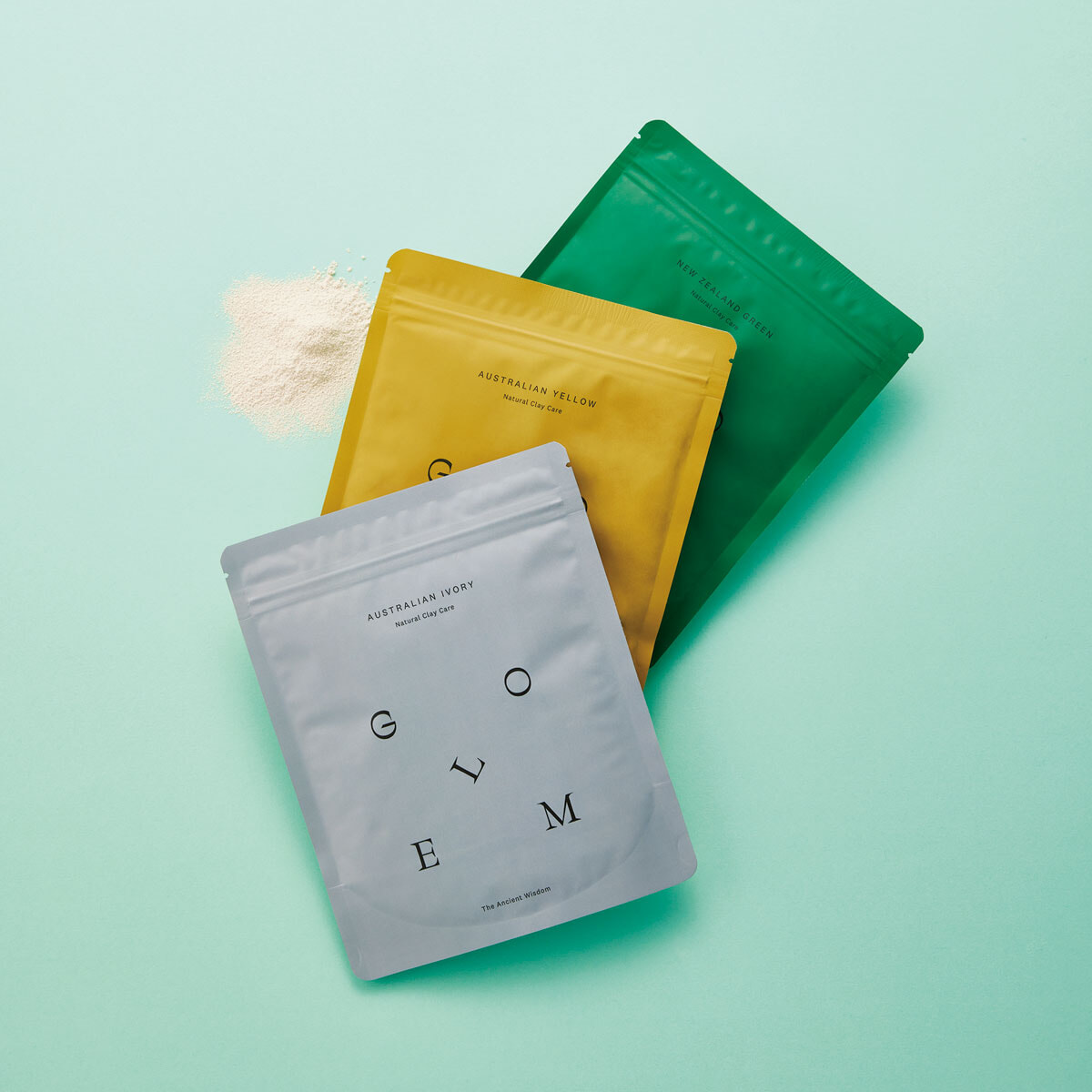手前から、オーストラリアン アイボリークレイ 100g ¥1,980、同 イエロークレイ 200g¥2,750、ニュージーランド グリーンクレイ 200g ¥3,190/以上ゴーレム