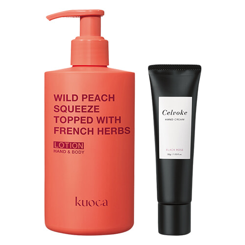 左:スキンケア成分としてホワイトトリュフを採用した韓国発のブランド。みずみずしいテクスチャーで肌と油分のバランスを整え、ベタつくことなく広範囲になじむ。野生の桃果汁とフレンチハーブのフレッシュな香り。エピキュアブレンド ワイルド ピーチ ハンド&ボディローション 300ml ¥4,800/インテルコスメシ・ジャパン 右:濃密なオーガニック植物油脂を独自の乳化技術でベタつかない質感に。凛とした存在感を残すブラックローズのノート。ハンドクリーム B 30g ¥2,640/セルヴォーク