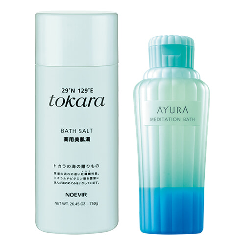 左:屋久島と奄美大島の間に位置するトカラ列島の海水から抽出したミネラルを豊富に配合。温浴効果を高め、開放的なバスタイムを演出。トカラの海の薬用美肌湯〈医薬部外品〉 750g ¥3,850/ノエビア 右:2021年に発売して人気を博した”青のメディテーションバス”が復刻。ドクダミ、桃の葉、ハッカといった夏の季節湯に用いられる成分とローズマリーやカモミールなどをブレンド。血行を促進しつつも、清々しさを残す。メディテーションバス 香涼み 300ml ¥2,750(限定発売)/アユーラ