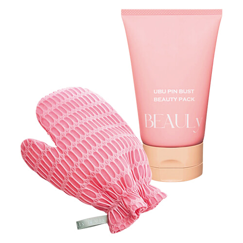 左:バスト専用のミトン。空気をたくさん含む構造で、いつものボディソープがふわふわの泡に。ビューリ うぶピン バストミトン ¥990 右:お風呂でバストになじませ、5分ほどおいて洗い流すだけ。ダイズ種子エキスやモモ葉エキスが潤いを与え、谷間の肌をトーンアップ。同 バストパック 100g ¥1,650/ともにコジット