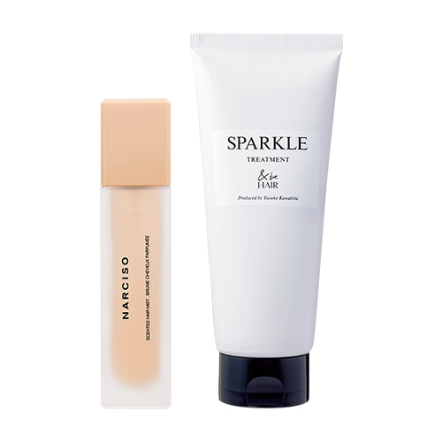 左:ヘアをダメージから保護する成分を豊富に配合。センシュアルな香りで髪を包み込み、なめらかな質感へと仕上げる。ナルシソ ヘアミスト 30ml ¥6,160/ナルシソ ロドリゲス パルファム 右:”ヘアケアは髪のベースメイク”をコンセプトにこの春誕生。ボリュームを潰さず、シルクのような光沢感を宿すヘアトリートメント。週に1度は、塗布後に5分ほど放置して洗い流すスペシャルパックを。アンドビーヘア スパークルトリートメント 200g ¥1,540/クルー