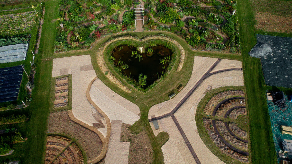 複数のエリアがある「分かち合いの庭」。共同創設者のトム・アルテュス=ベルトランは、父ヤンが撮影した有名なニューカレドニアのハート形の地形のフォルムで沼を作って捧げた。