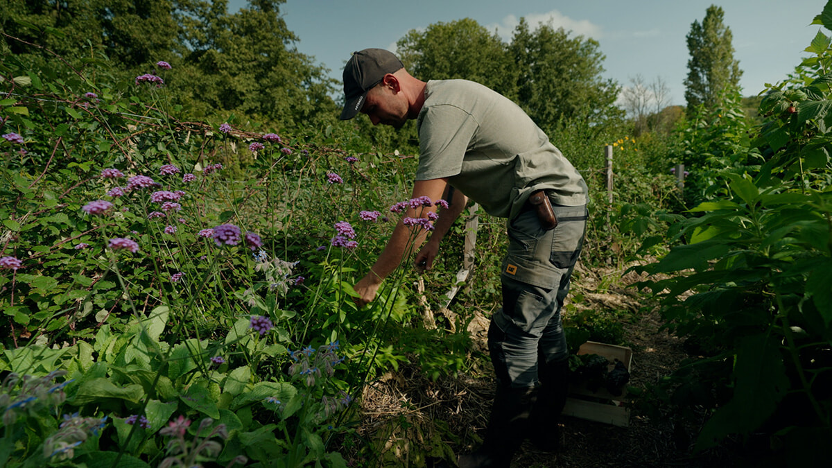 ミリエール渓谷に生まれたトム。「分かち合いの庭」には、森のような菜園、森林農法、野菜や果物の栽培など、複数のエリアを作った。