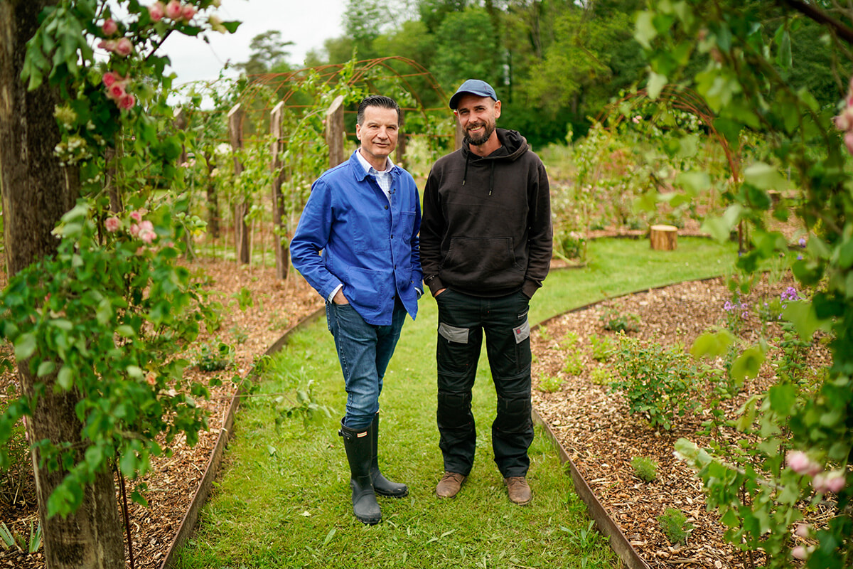 「香りの回廊」にて。薬草についても学んだというゲランの5代目調香師ティエリー・ワッサー(左)とトム(右)。アーチの蔓バラのナエマは1979年にジャン・ポール・ゲランが調香した香水「ナエマ」へのオマージュ。