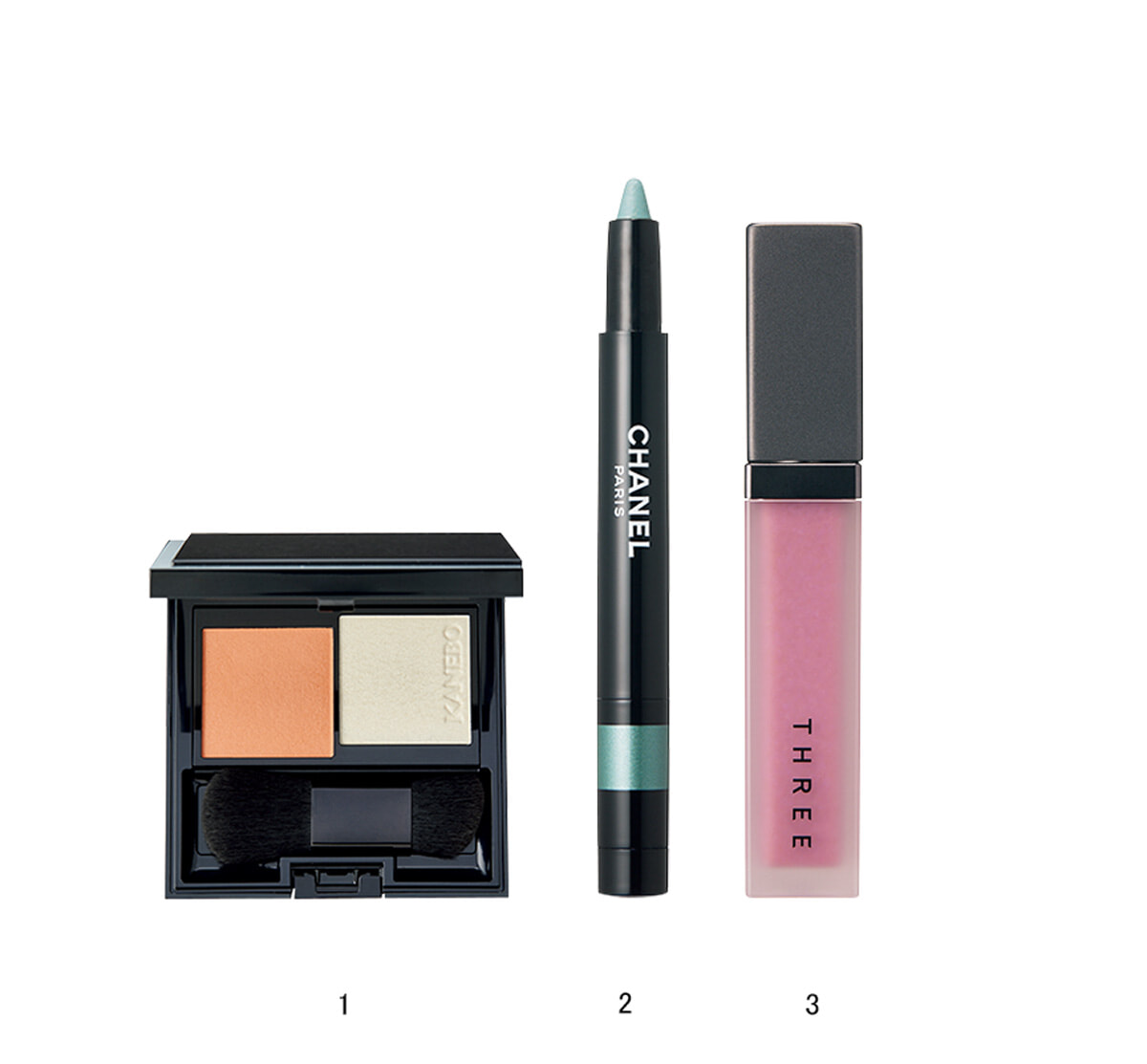 1の2色をブラシでブレンドしながら取り、アイホールのくぼみから頰骨の高い部分に向かってふわっと囲むように広げる。目尻下に右のハイライトを重ね、光を集める。2のペンシルを下まぶたのインサイドと涙袋に引いて色をのせる。リップは輪郭をあまり意識せず、3のリキッドを直塗りでラフに。