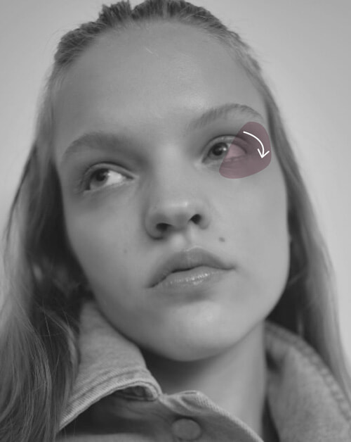 目周りを多幸感のあるオレンジで染めることで、ヘルシーで開放的な印象に。光の角度によって繊細に煌めくハイライト効果の高いチークを選ぶのがポイント。
