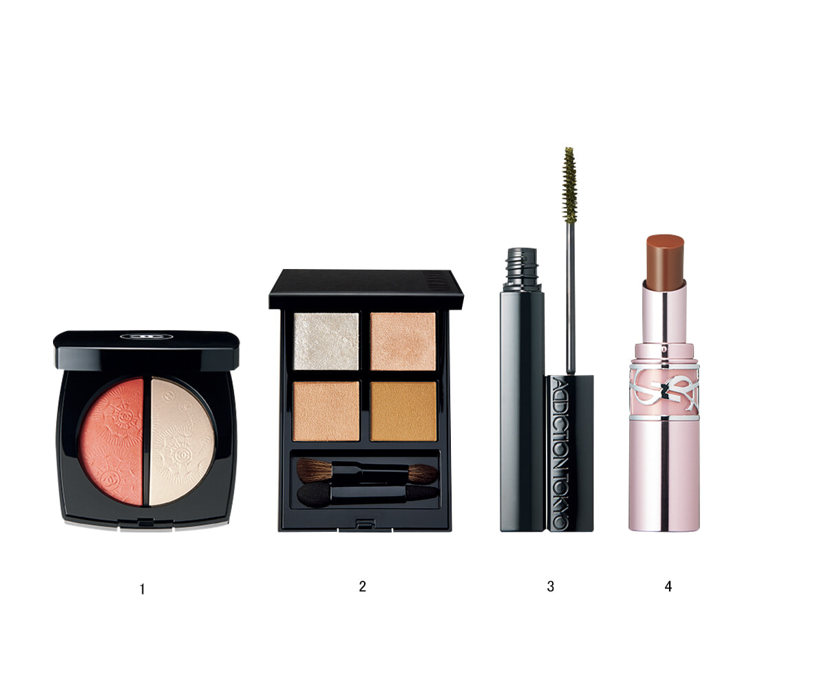 1の左を付属のブラシに取り、頰骨中央下を起点に扇状に色をのせる。陰影をつくる感覚で、顔の輪郭のキワまで広範囲に色をなじませる。アイメイクは2の左上のグリッターを指先に取り、目頭にトントンとのせ、3のマスカラはまつ毛の先端のみに色をオン。唇は4をややオーバー気味に直塗り。