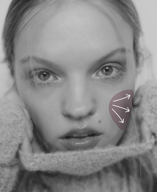 恥ずかしくて耳までじわっと赤くなる……そんなシャイな表情を連想させるチークは、頰の中央からフェイスラインに向かって血色が広がっていくようにつくって。