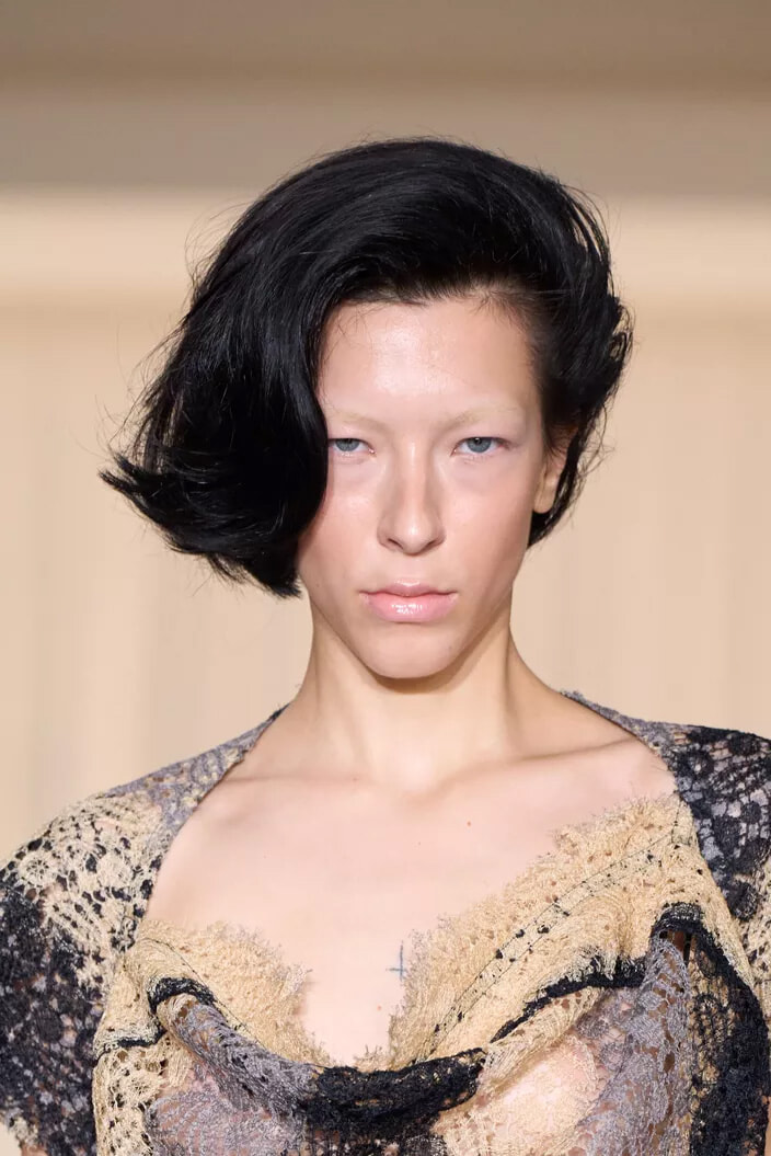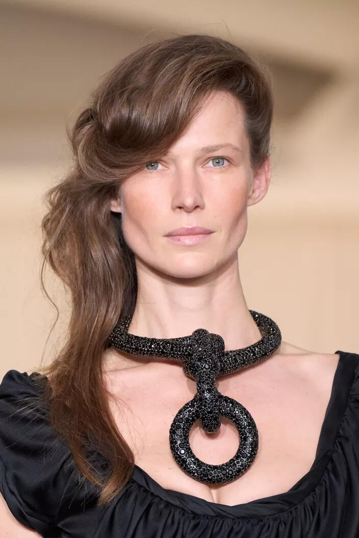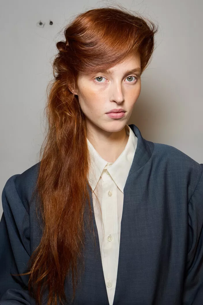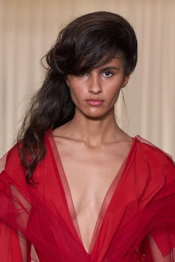顔の前で髪を大きく盛りあげて彫刻的に作りあげ、対照的に後ろの髪は自然な質感のまま残した。「ロングヘアを自然に流すことで、80年代にインスパイアされつつも、現代的なアレンジを加えました」とヘアスタイリストは今回のヘアスタイルについて語った。