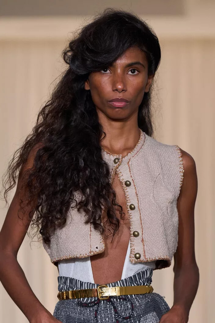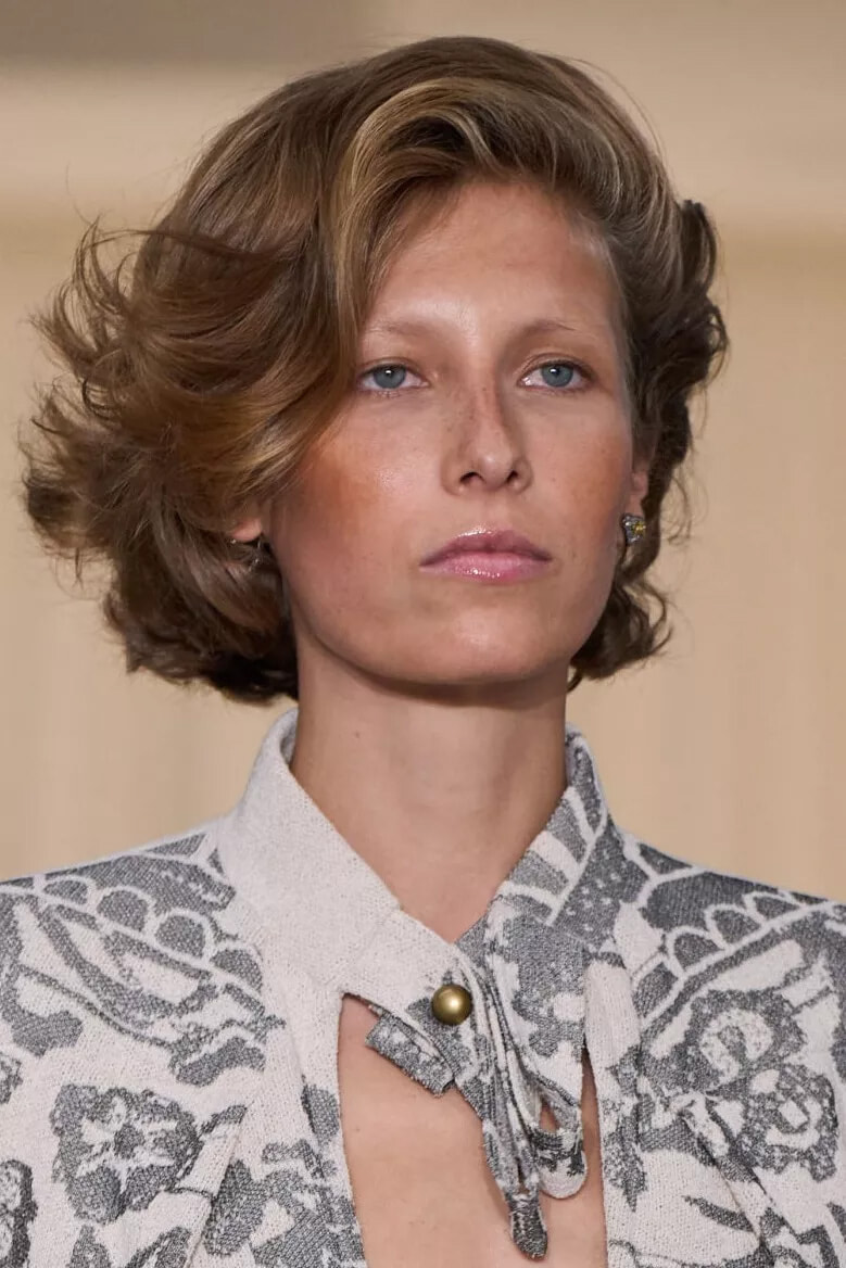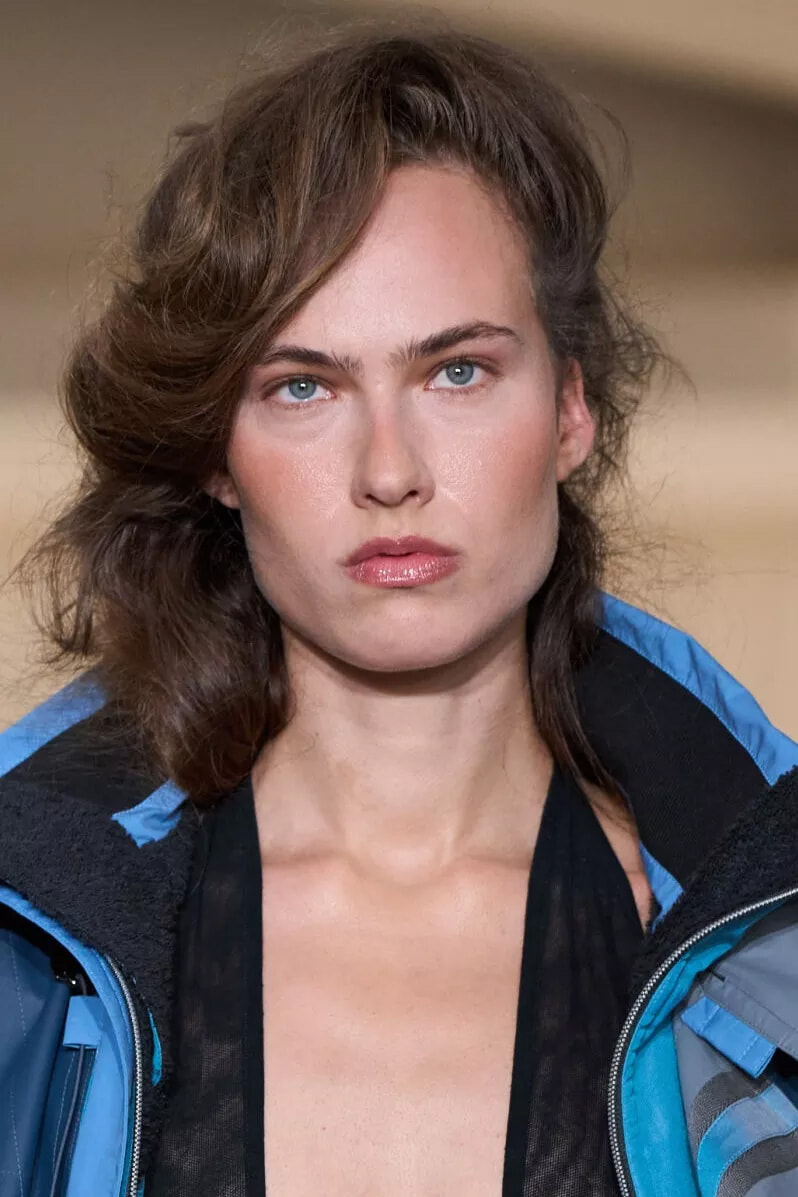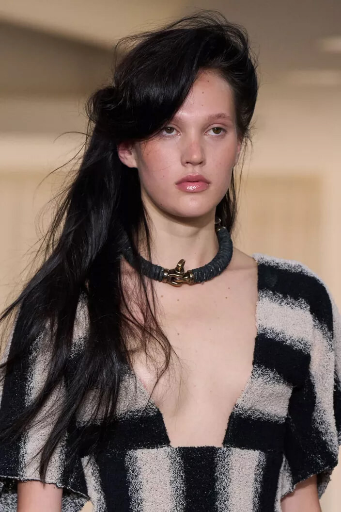 顔の前で髪を大きく盛りあげて彫刻的に作りあげ、対照的に後ろの髪は自然な質感のまま残した。「ロングヘアを自然に流すことで、80年代にインスパイアされつつも、現代的なアレンジを加えました」とヘアスタイリストは今回のヘアスタイルについて語った。