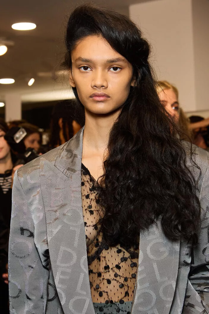 「80年代の”スローン・レンジャー”たちのように前頭部にボリュームを出し、ウェーブを作るために入念にブローして完璧に乾かしました。それを横に流してピン止めしています」とサム・マクナイトは今回のスタイルを語る。出番前のモデルたちはブローされたり、カーラーで髪を巻いたりと、バックステージはまるで80年代の美容院さながらの雰囲気だった。